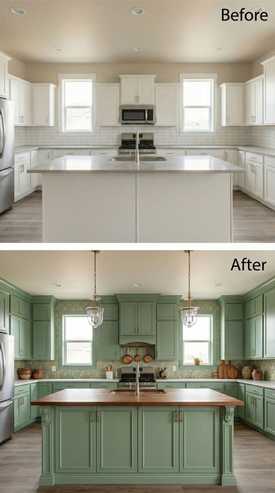 Builder-grade kitchen backsplash transforms dramatically with sage green cabinetry and intricate patterned tiles. Warm brass pendant lights replace basic recessed lighting, while a rich butcher block countertop contrasts beautifully against the muted green palette. Copper cookware and brass hardware elevate the space from standard builder finishes to a sophisticated, lived-in kitchen that balances modern functionality with timeless charm.