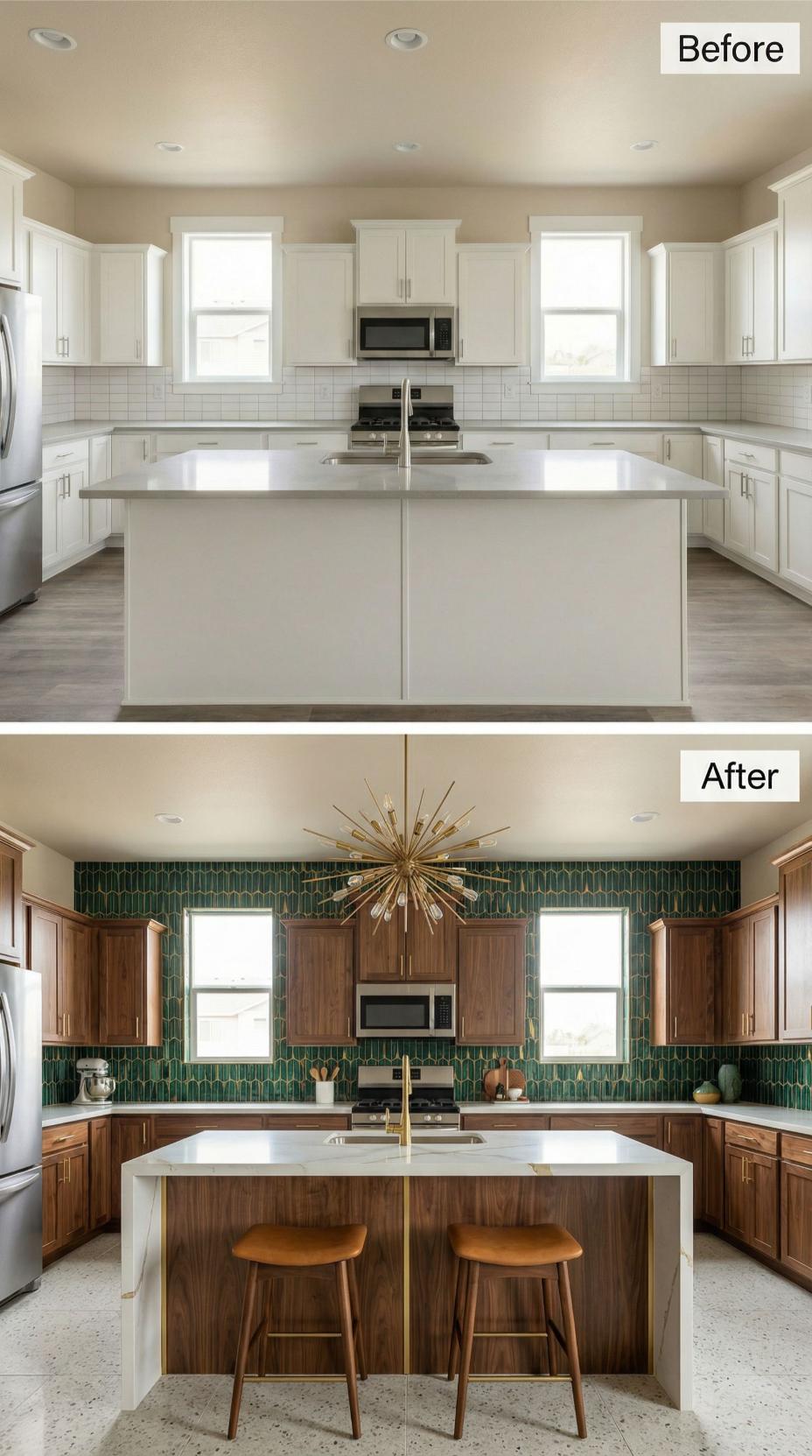 White subway tiles gave way to stunning emerald green geometric backsplash tiles that transform this kitchen from bland to breathtaking. Rich walnut cabinetry replaced the builder-grade white units, creating warm contrast against the vibrant tile pattern. Golden brass fixtures and a dramatic sputnik chandelier elevate the space with mid-century modern sophistication and undeniable personality.