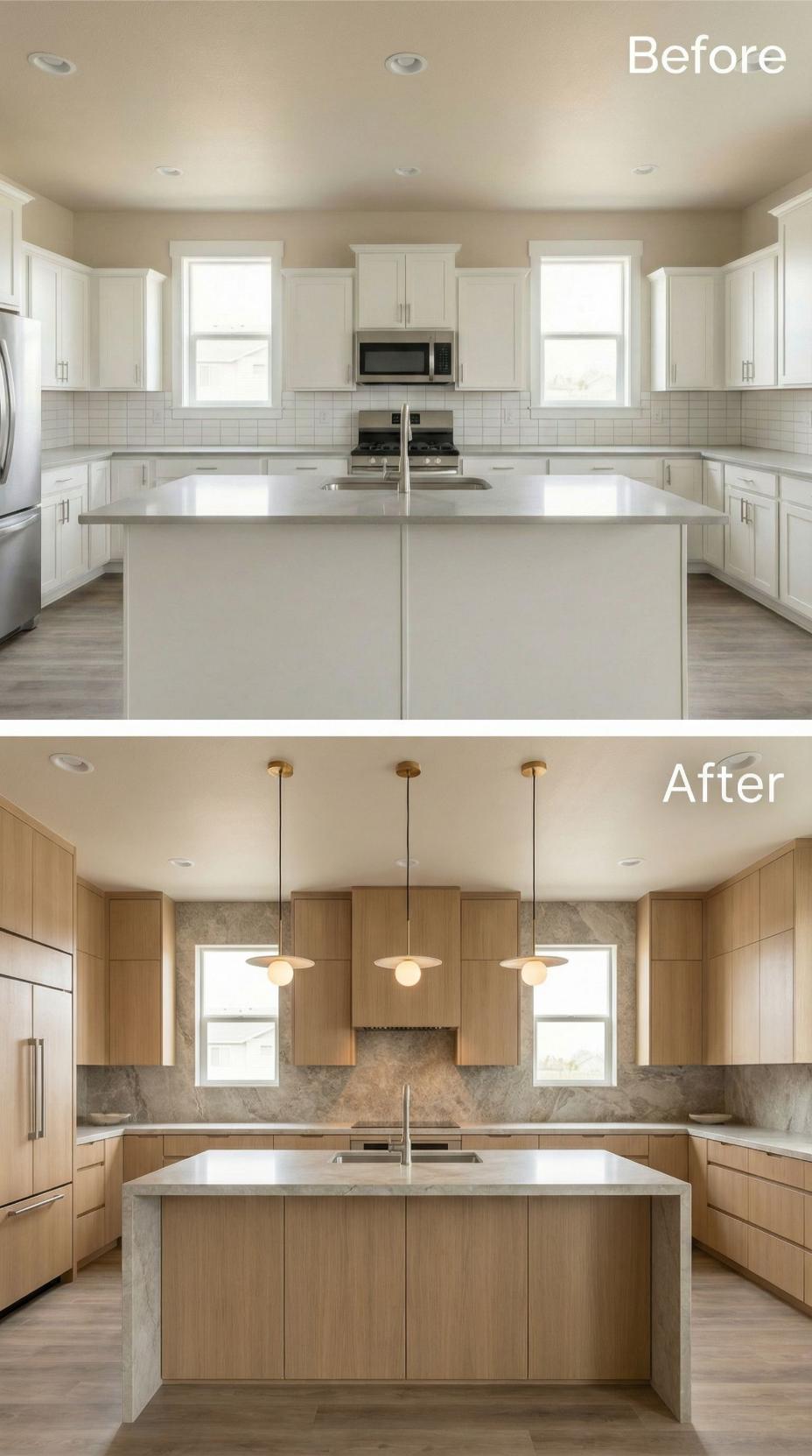 White oak cabinetry transforms this builder-grade kitchen backsplash into a sophisticated culinary workspace. The dramatic veined stone backsplash creates stunning visual impact against warm wood tones, while three brass pendant lights add elegant task lighting over the waterfall-edge island. Clean horizontal lines and handleless cabinet doors maintain the streamlined aesthetic throughout.