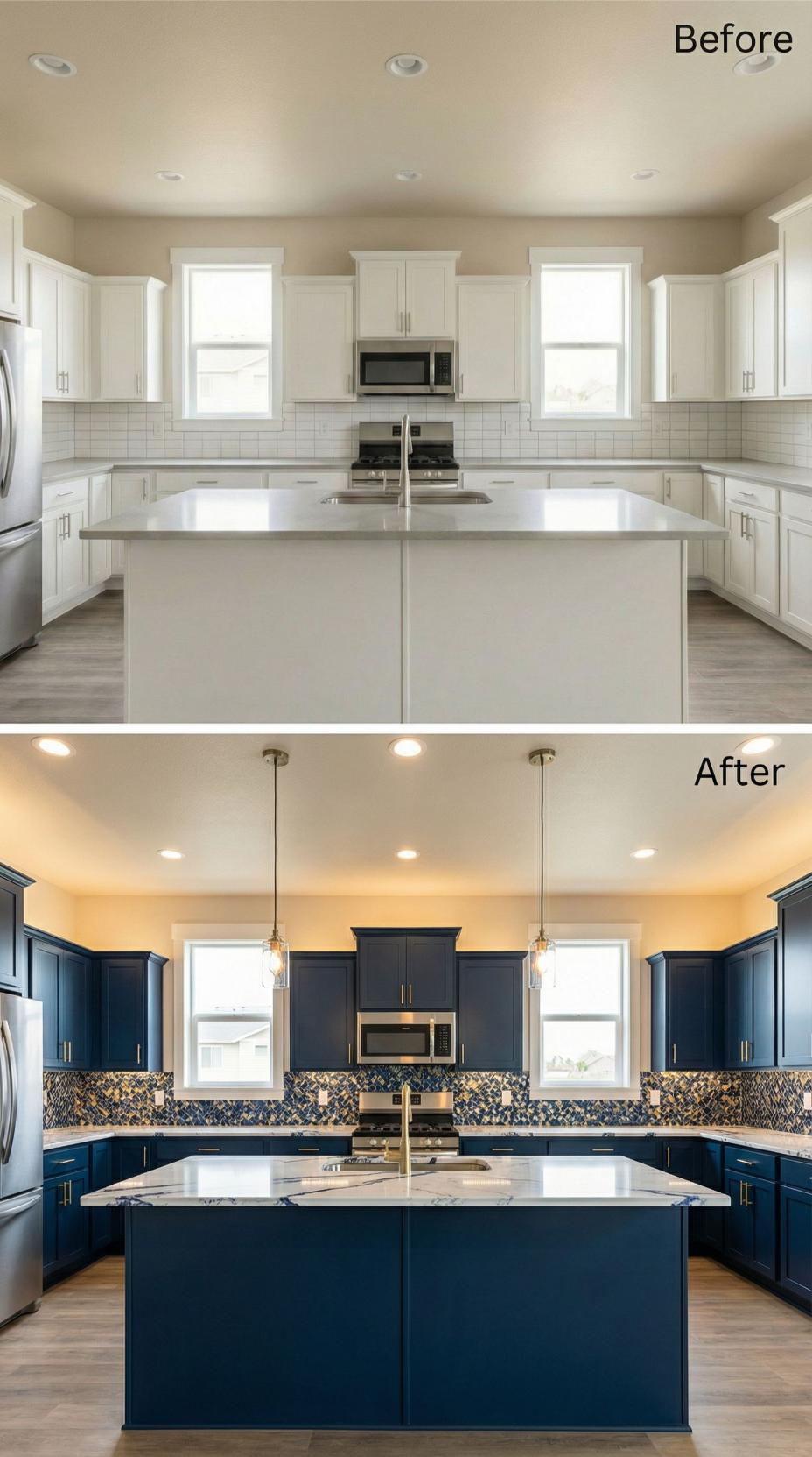Bold navy cabinets replace crisp white ones while a stunning geometric mosaic backsplash transforms the builder-grade kitchen backsplash into a statement feature. Warm brass hardware and pendant lights add luxurious contrast against the deep blue cabinetry. The marble-look island maintains elegance while the dramatic color palette creates sophisticated visual depth throughout the renovated space.