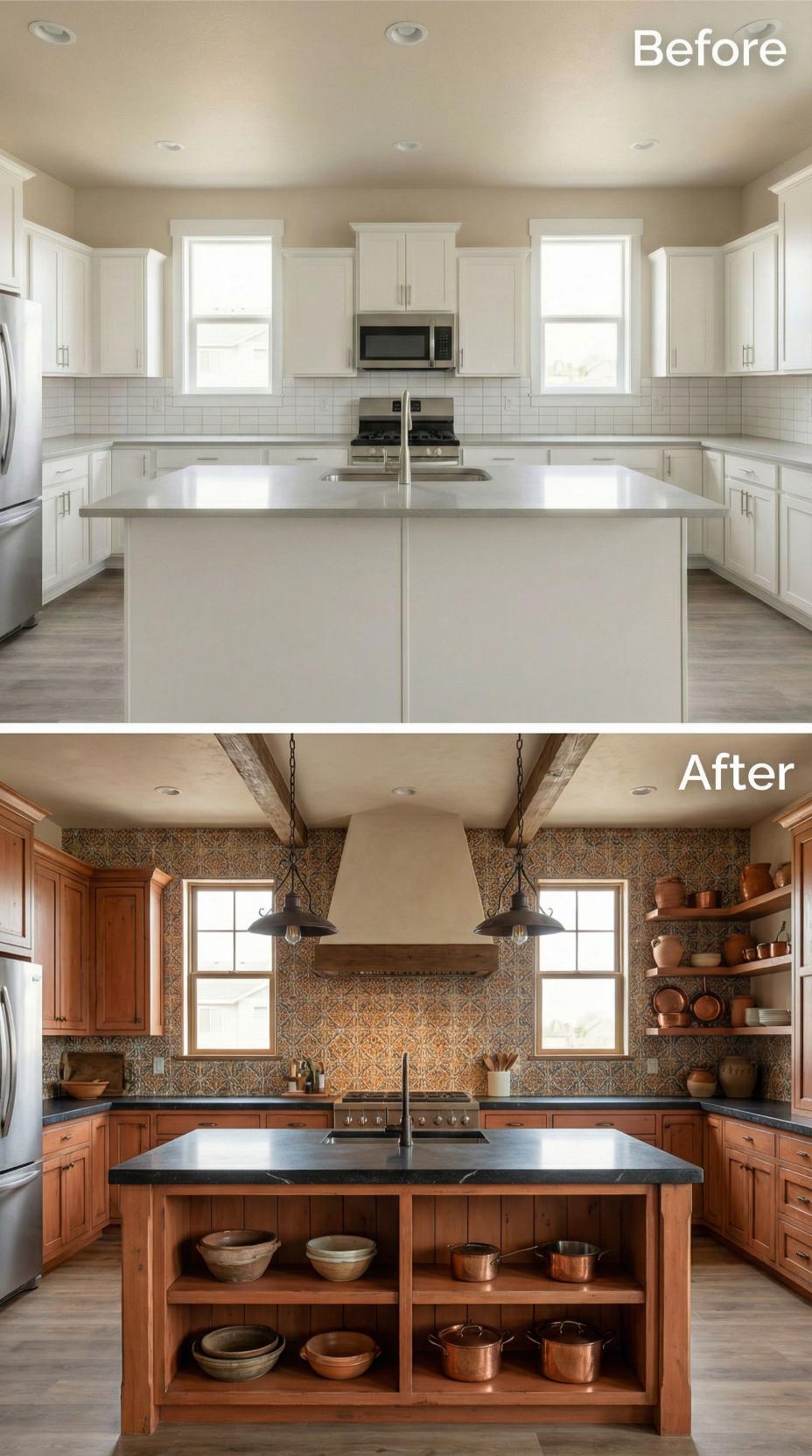 Builder-grade kitchen backsplash transforms dramatically with intricate patterned tiles that create stunning visual impact. Warm wood cabinetry replaces sterile white finishes while exposed ceiling beams add rustic charm. Open shelving showcases pottery collections, and pendant lights suspended by chains enhance the Mediterranean aesthetic. Dark countertops ground the space while copper cookware adds authentic warmth to this complete renovation.