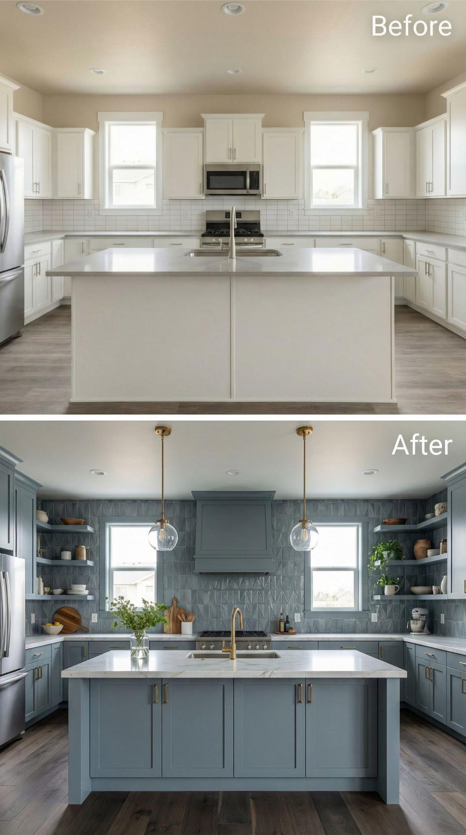 Bold blue-green cabinetry transforms this builder-grade kitchen backsplash into a sophisticated culinary workspace. Geometric backsplash tiles create visual interest while brass pendant lights and matching faucet elevate the metallic accents. Open shelving replaces upper cabinets, showcasing curated dishware and adding functional storage. The monochromatic blue palette flows seamlessly from cabinetry to walls, creating cohesive depth throughout the space.