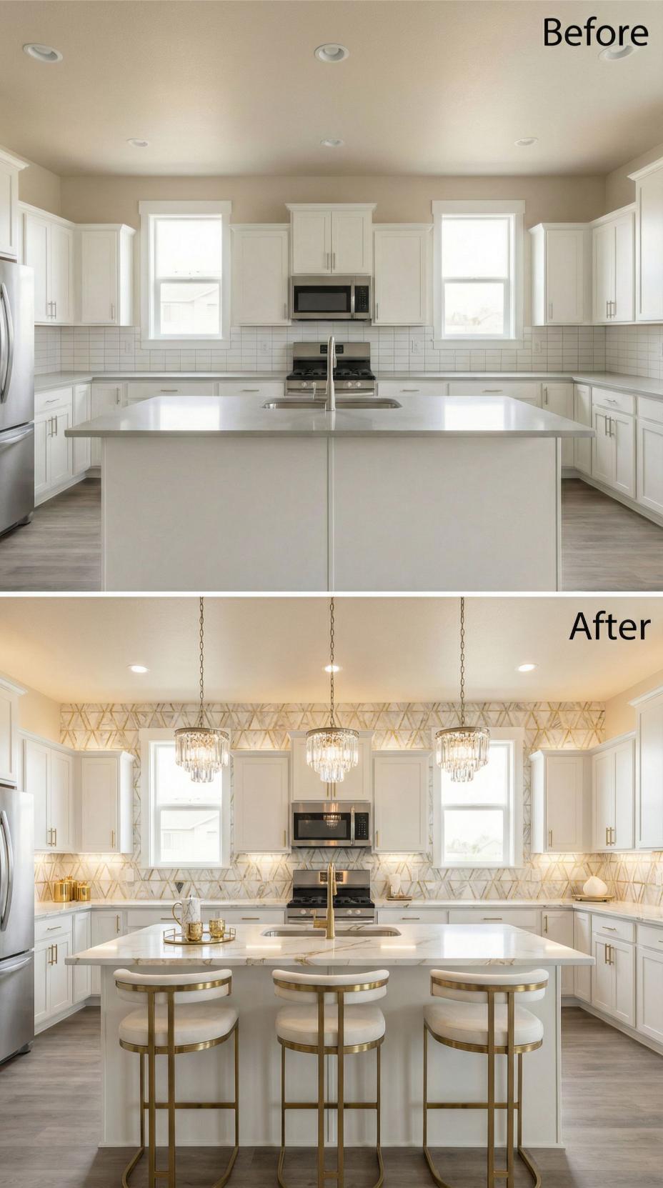 Builder-grade kitchen backsplash transforms dramatically with the addition of stunning geometric diamond-patterned tile and crystal pendant lighting. The sophisticated backsplash extends behind the range hood, creating visual continuity while brass-finished bar stools complement the warm metallic accents. Under-cabinet lighting enhances the tile’s dimensional quality, while three crystal chandeliers replace basic recessed fixtures to elevate the entire space from standard to spectacular.
