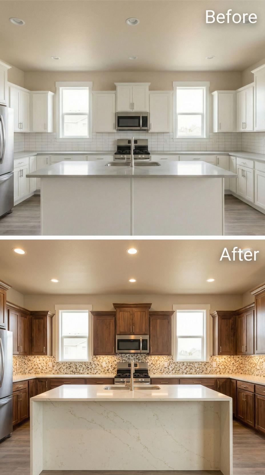 Builder-grade kitchen backsplash transforms dramatically with rich walnut cabinetry replacing stark white units and an intricate mosaic tile backsplash elevating the entire space. Warm wood tones create depth against the neutral quartz countertops, while the decorative backsplash adds texture and visual interest. The upgraded design maintains clean lines while introducing sophisticated materials that complement the stainless steel appliances beautifully.