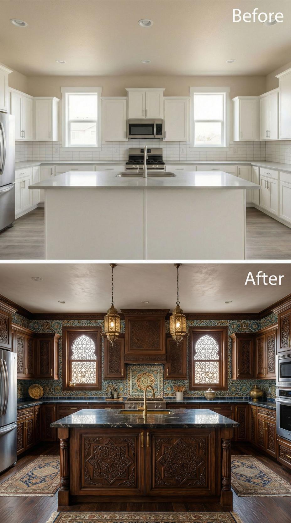 Ornate hand-carved walnut cabinetry replaces plain white shaker doors, while an elaborate geometric mosaic backsplash transforms the builder-grade kitchen backsplash into a stunning focal point. Traditional Moroccan lattice windows filter natural light beautifully, and antique brass pendant lanterns cast warm ambient lighting. Dark granite countertops and rich hardwood floors complete this dramatic Mediterranean-inspired transformation.