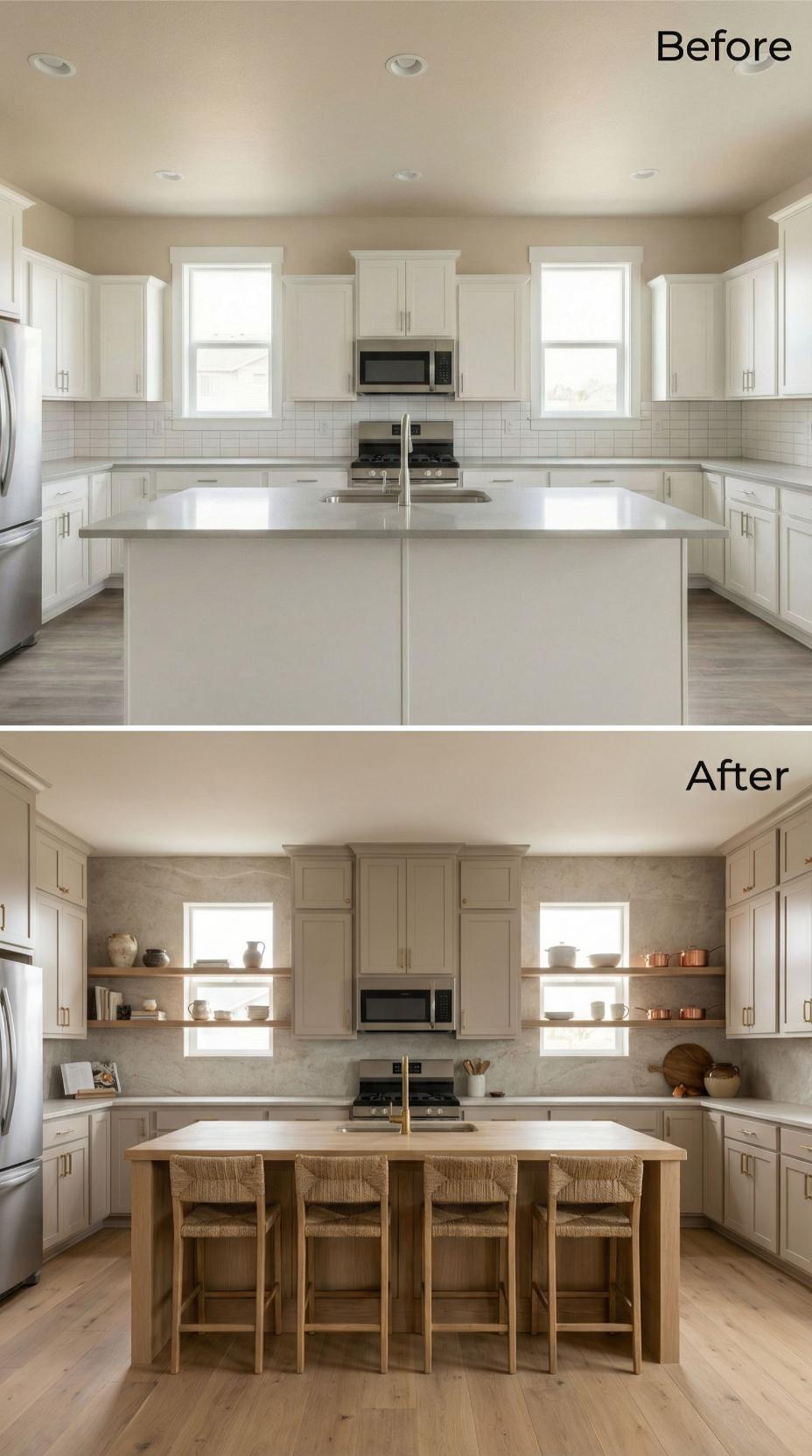 White subway tile backsplash transforms into luxurious natural stone with rich texture and earthy warmth. Open shelving flanking both windows replaces upper cabinets, creating an airy display for ceramics and copper accents. The wooden island with woven bar stools adds organic warmth, while brass fixtures elevate the entire space from basic builder-grade to sophisticated modern farmhouse elegance.