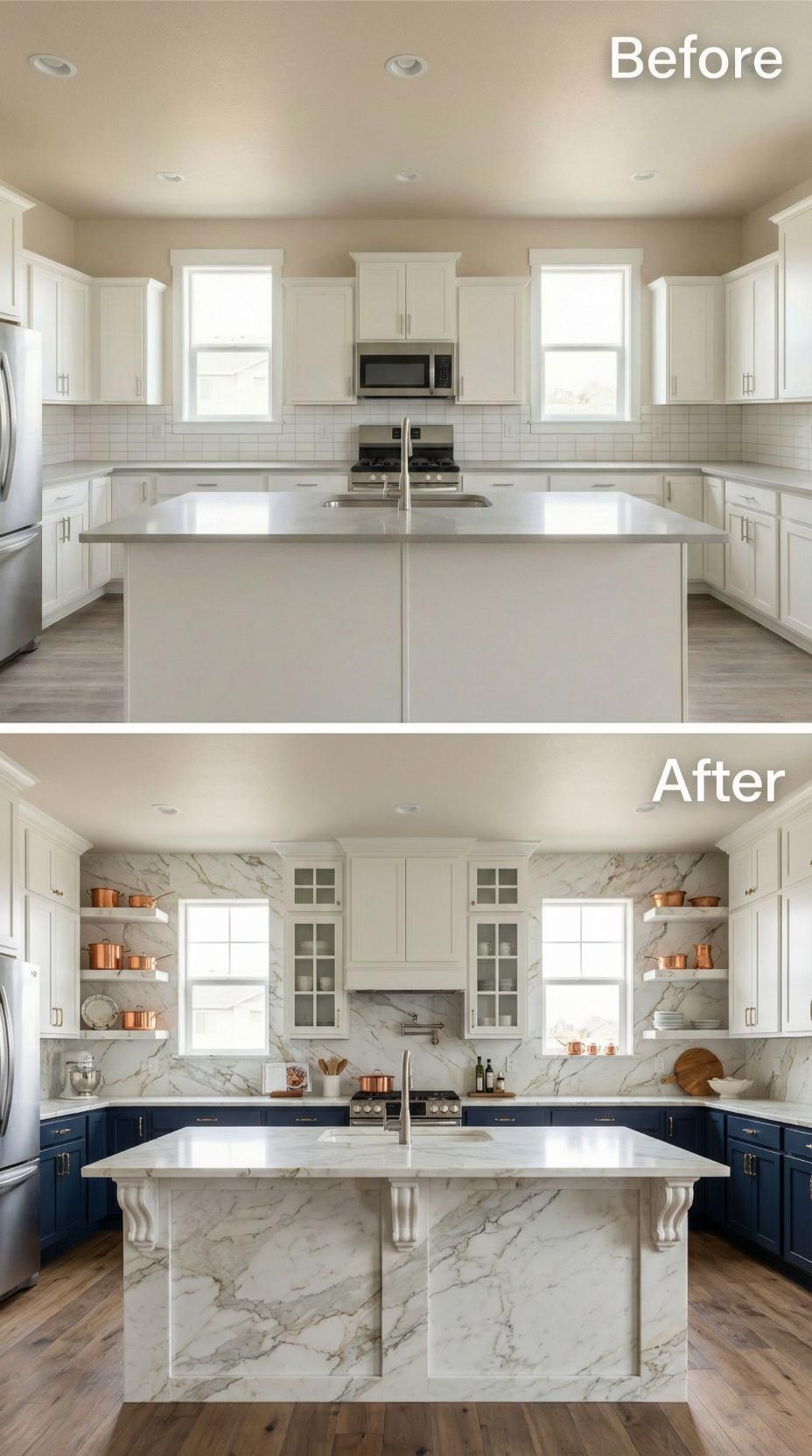 White subway tile transforms into show-stopping Calacatta marble that extends from countertop to ceiling, creating a luxurious backdrop for this sophisticated kitchen renovation. Navy lower cabinets replace the builder-grade all-white scheme, while glass-front upper cabinets and floating shelves showcase beautiful copper cookware. The marble island gains architectural corbels and rich veining that elevates the entire space from basic to breathtaking.