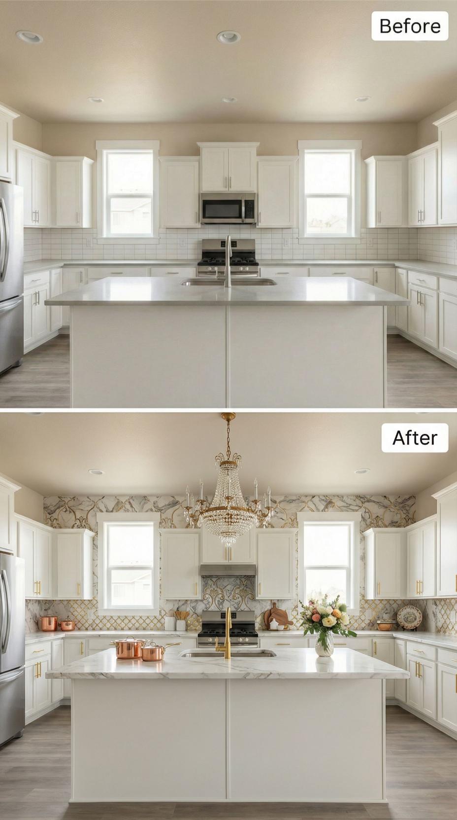 Builder-grade kitchen backsplash transforms into an opulent culinary masterpiece featuring dramatic Calacatta marble extending from countertop to ceiling. Ornate cream cabinetry with gilded details replaces simple white shaker doors, while crystal chandeliers add romantic elegance above the enlarged island. Rich herringbone hardwood flooring and decorative crown molding complete this sophisticated European-inspired renovation.