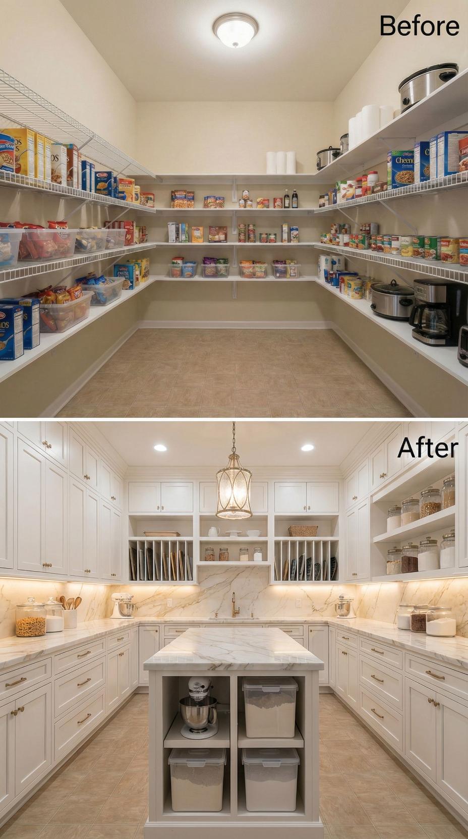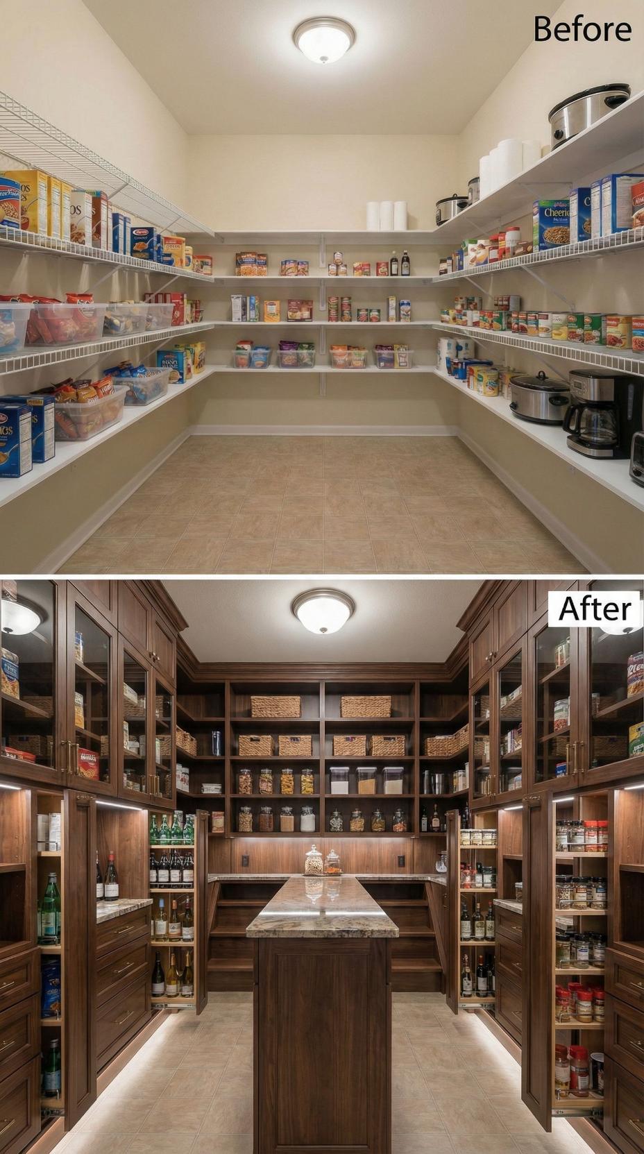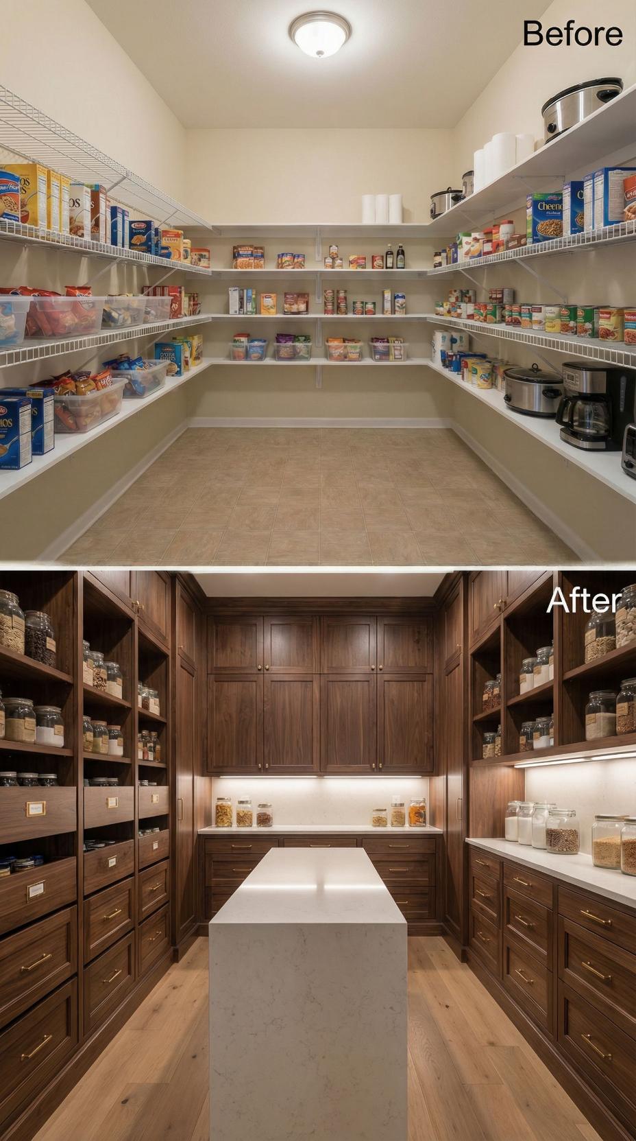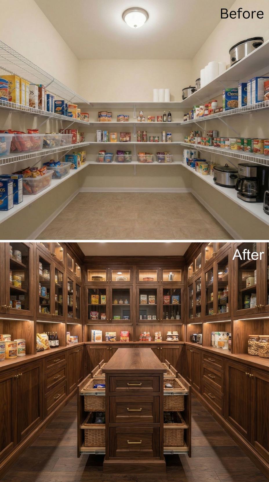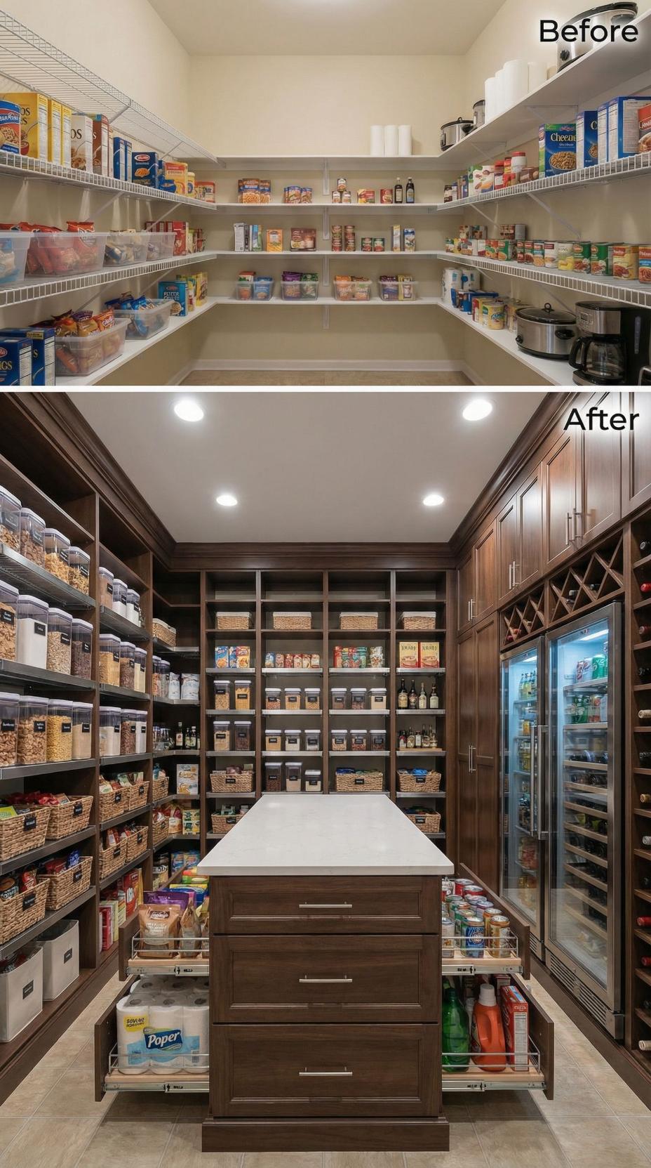 When we bought our home, the walk-in kitchen pantry was huge—but painfully builder grade. Plenty of space, zero intelligence. Instead of settling for wire shelves and wasted square footage, we imagined what this room could become with custom wood built-ins, clever storage systems, and a no-compromises budget. These before-and-after pantry makeovers show how thoughtful design, center islands, and smart organization turn a basic pantry into a true luxury workhorse.