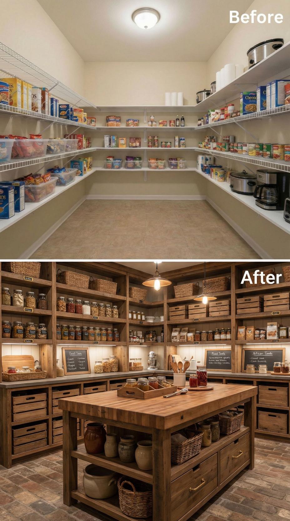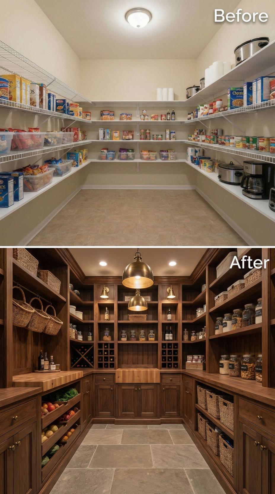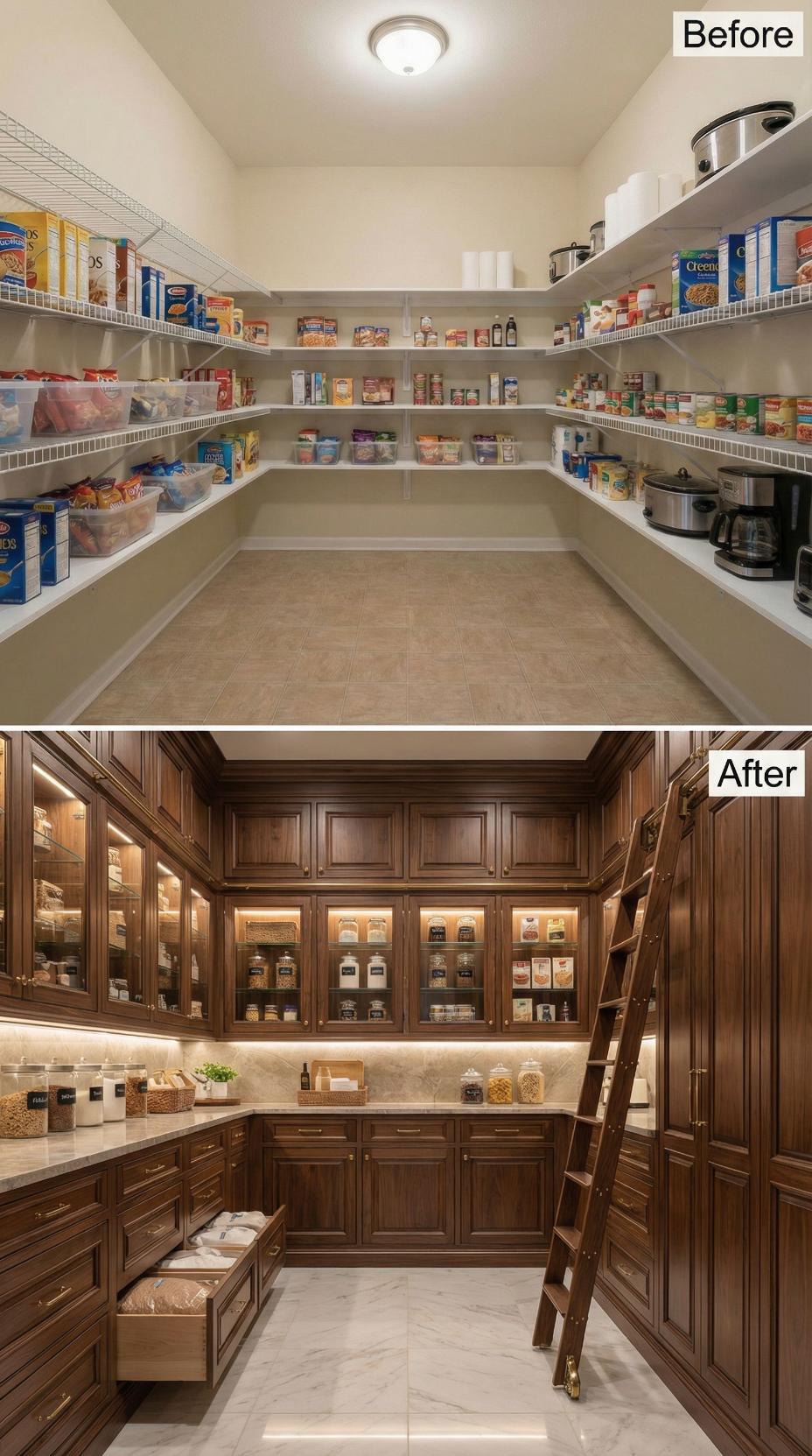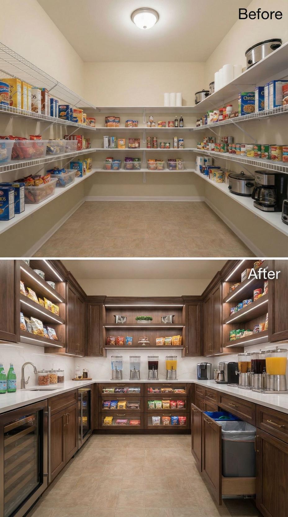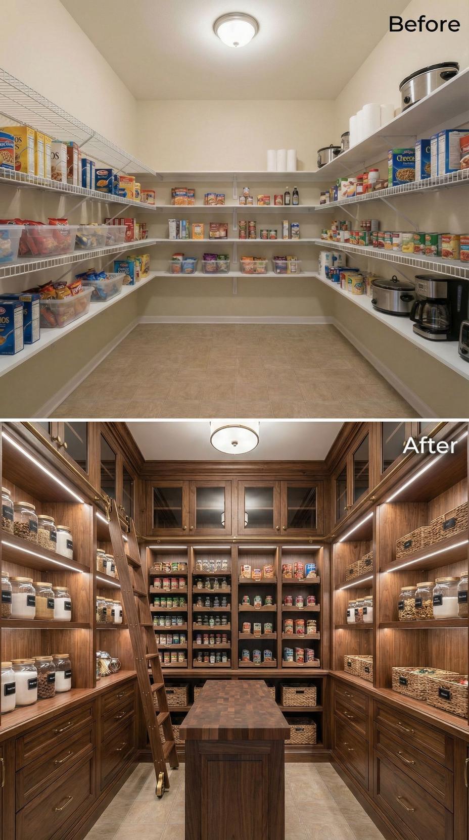 When we bought our home, the walk-in kitchen pantry was huge—but painfully builder grade. Plenty of space, zero intelligence. Instead of settling for wire shelves and wasted square footage, we imagined what this room could become with custom wood built-ins, clever storage systems, and a no-compromises budget. These before-and-after pantry makeovers show how thoughtful design, center islands, and smart organization turn a basic pantry into a true luxury workhorse.