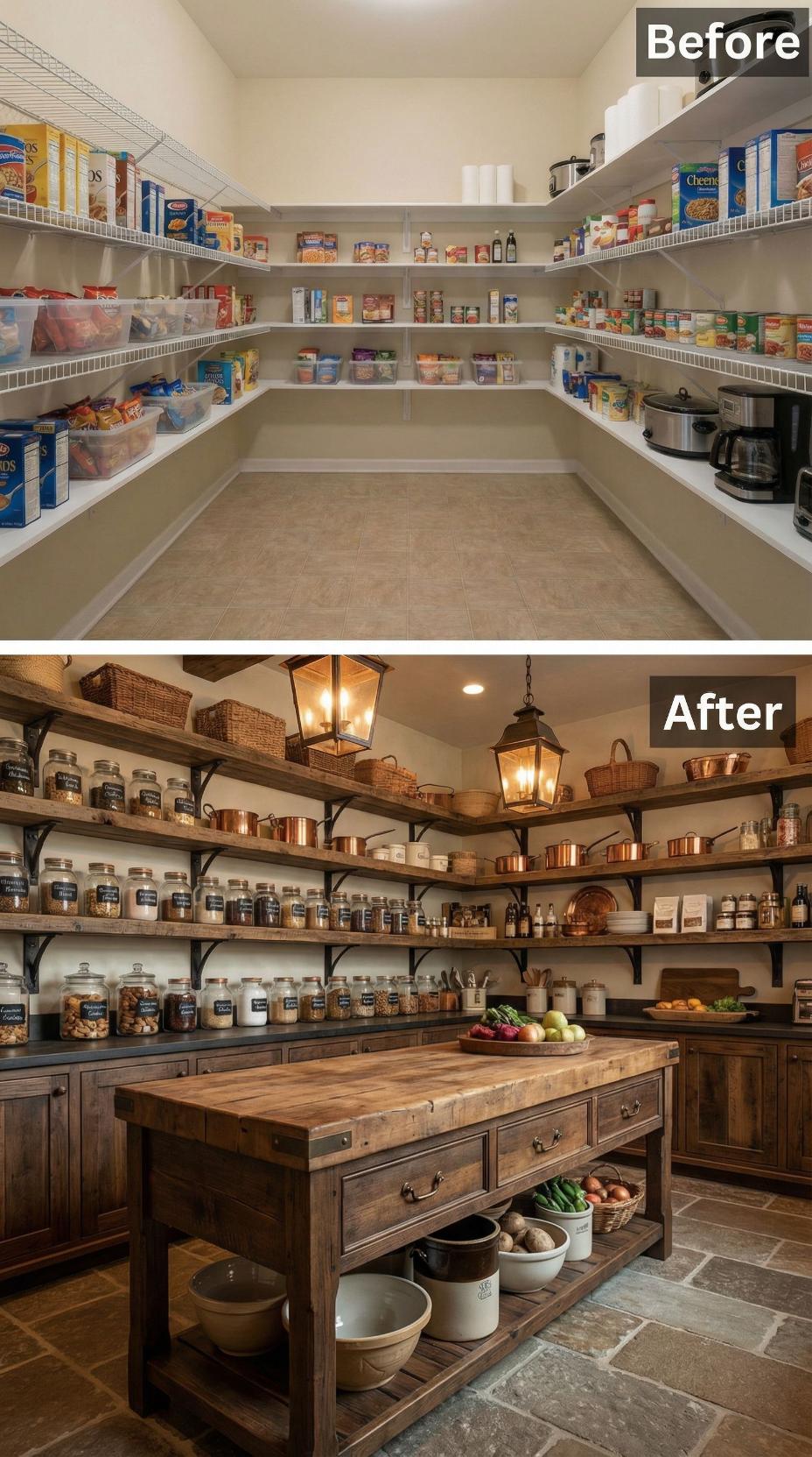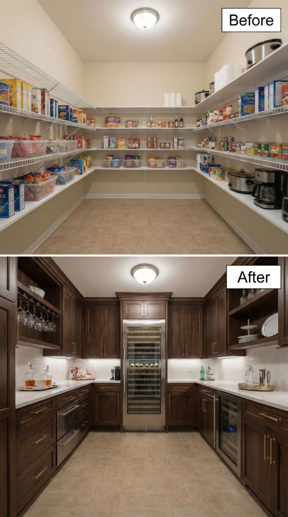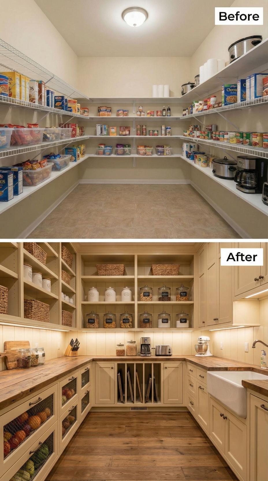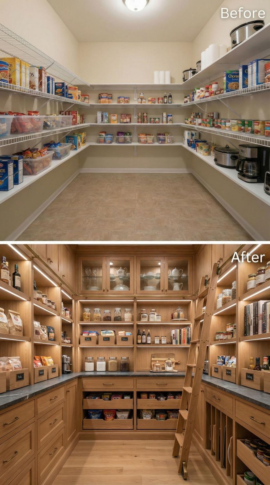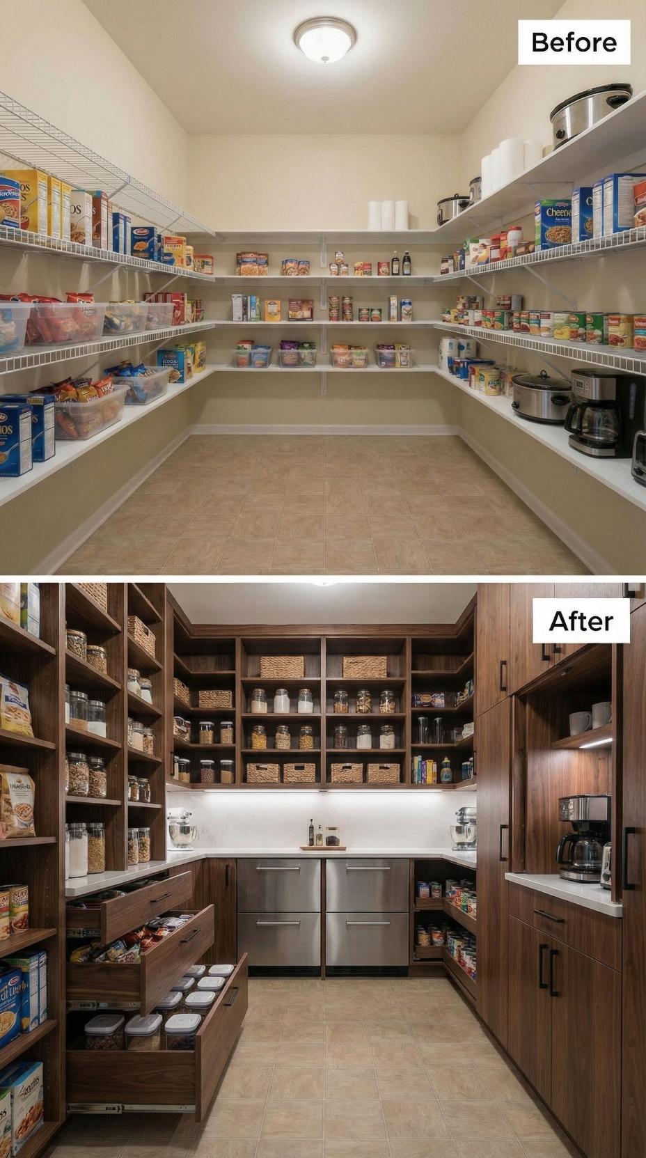 When we bought our home, the walk-in kitchen pantry was huge—but painfully builder grade. Plenty of space, zero intelligence. Instead of settling for wire shelves and wasted square footage, we imagined what this room could become with custom wood built-ins, clever storage systems, and a no-compromises budget. These before-and-after pantry makeovers show how thoughtful design, center islands, and smart organization turn a basic pantry into a true luxury workhorse.
