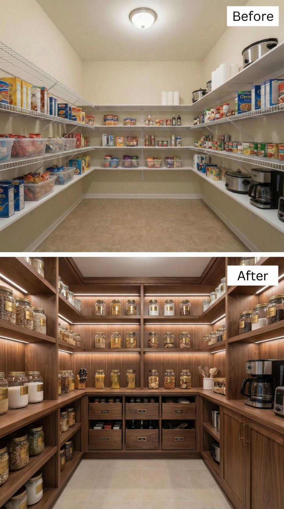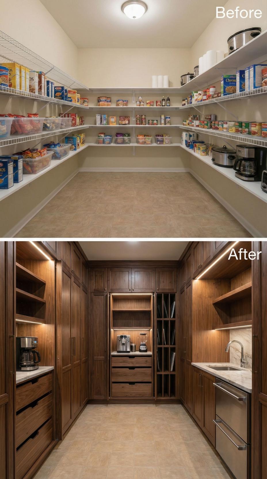 Wire shelving and basic white walls transform into a luxurious walnut wood pantry featuring custom cabinetry with integrated LED strip lighting. Pull-out drawers maximize corner storage while concealed appliance garages house coffee makers and small appliances. Rich wood grain creates warmth against sleek hardware, elevating everyday meal prep into an organized, spa-like experience.