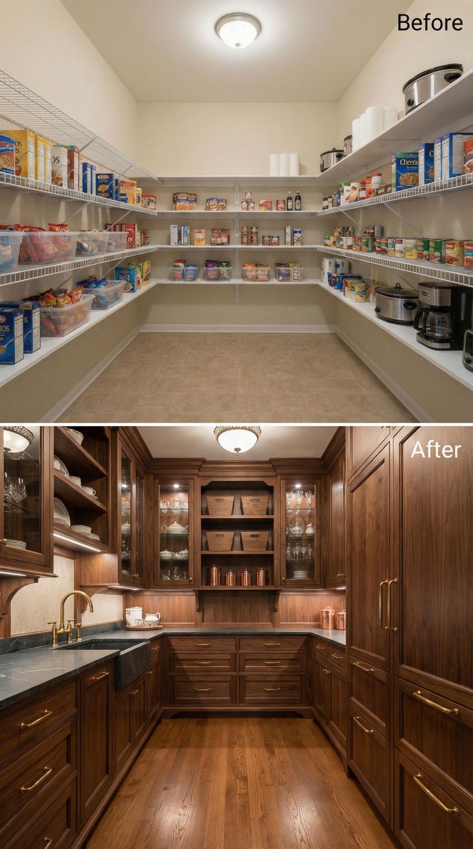Wire shelving and basic storage transform into an elegant butler’s pantry featuring rich walnut cabinetry and brass hardware. Custom millwork maximizes every inch with glass-front display cabinets, deep drawers, and open shelving. Granite countertops create functional workspace while under-cabinet lighting illuminates the sophisticated design. Warm wood tones and traditional styling elevate this once-basic storage space into a luxurious culinary sanctuary.