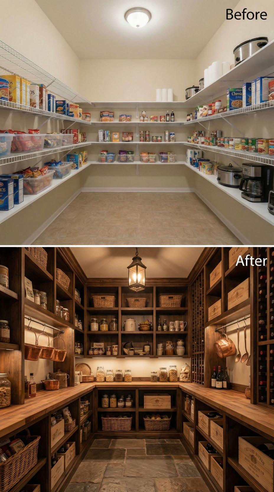 Dark walnut custom shelving transforms this basic pantry into a sophisticated storage sanctuary. Wicker baskets and wooden wine crates replace plastic containers, while warm pendant lighting creates an inviting glow. Under-cabinet LED strips illuminate glass storage jars filled with bulk ingredients, and a dedicated wine rack adds luxury. Rich wood countertops provide ample prep space for this now magazine-worthy pantry.