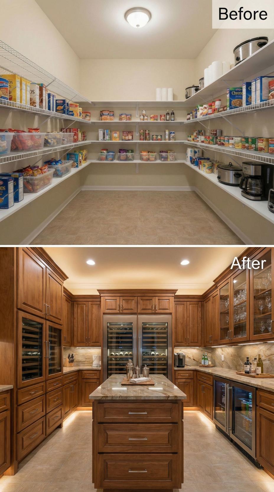 Custom walnut cabinetry completely transforms this builder grade kitchen pantry into a sophisticated storage masterpiece. Rich wood finishes replace basic wire shelving, while a marble-topped center island adds workspace and pull-out drawer storage below. Glass-front refrigeration units, wine storage, and organized container systems create restaurant-quality functionality that rivals professional kitchens.