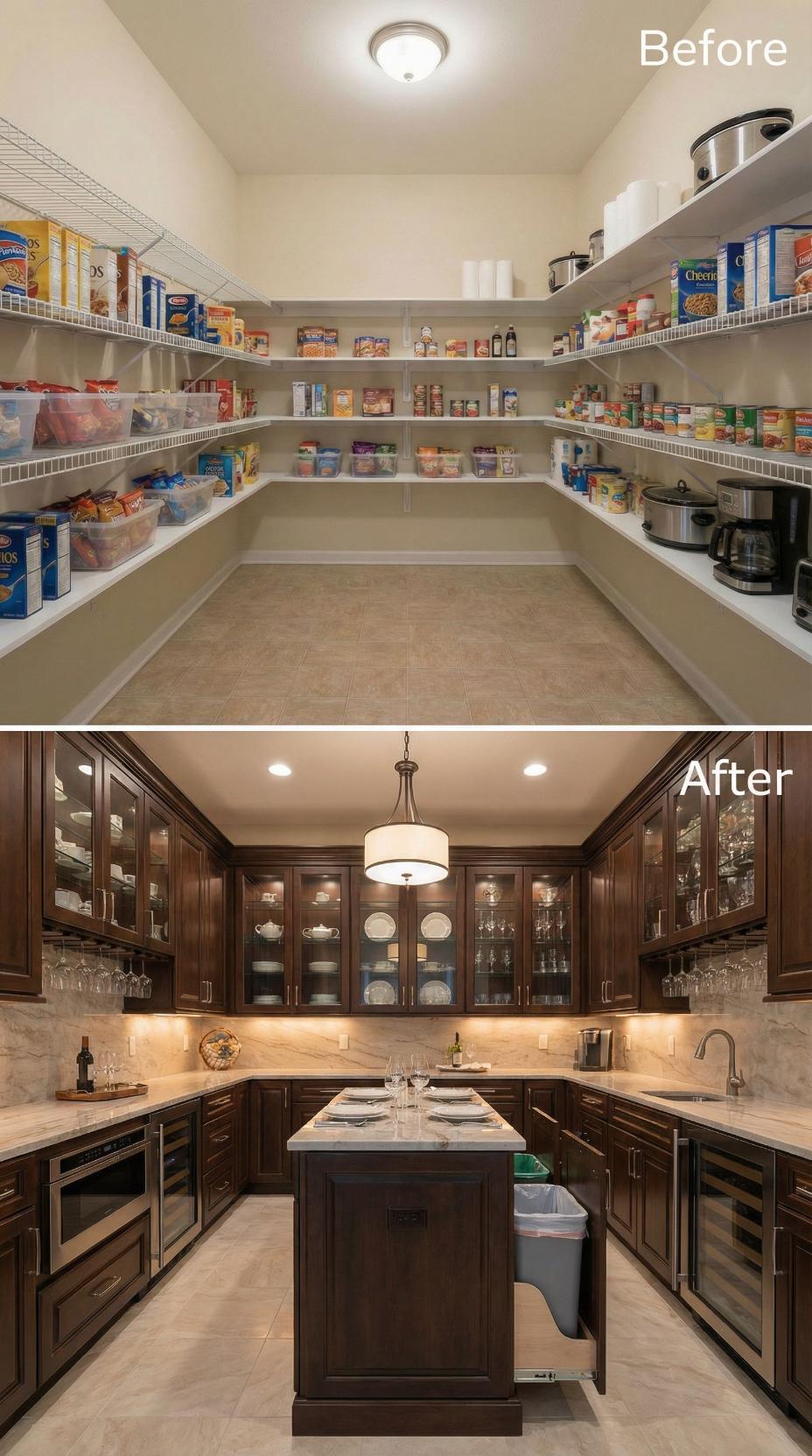Wire shelving and basic storage transform into an elegant entertaining command center with rich espresso cabinetry and marble countertops. Glass-front upper cabinets showcase fine china and glassware, while integrated wine storage and under-cabinet lighting elevate functionality. The central island provides additional prep space and concealed storage, turning a utilitarian builder grade kitchen pantry into a luxurious butler’s pantry perfect for hosting.