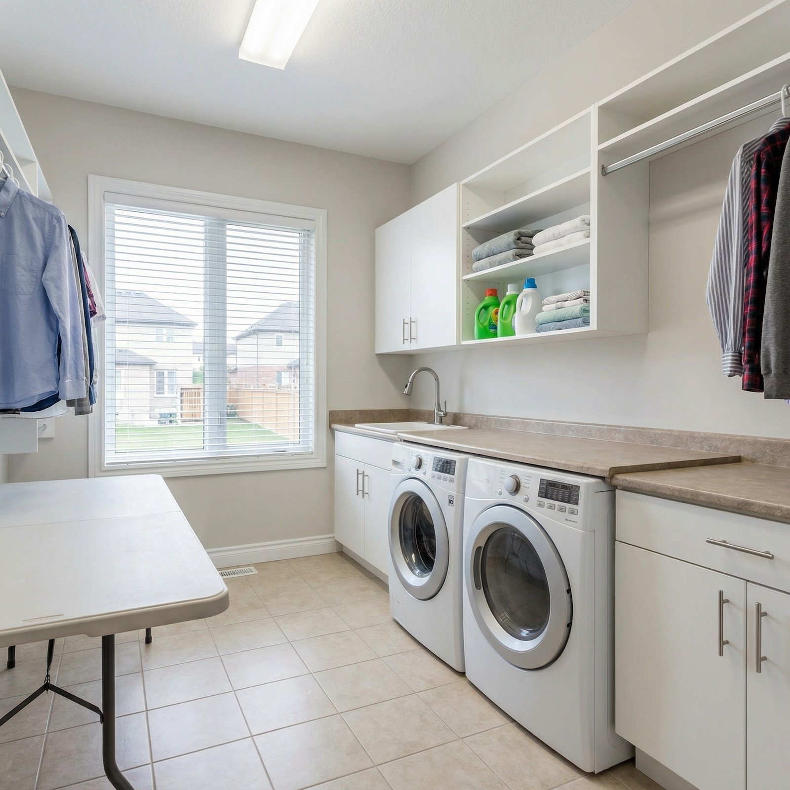 Brass-finish faucets flank a marble counter that stretches across both machines, while the floor transitions from beige ceramic tile to large-format porcelain with olive-green grout lines. Roman shades in natural linen replace horizontal blinds. A fold-down ironing surface in whitewashed oak occupies the left wall, eliminating the plastic folding table.