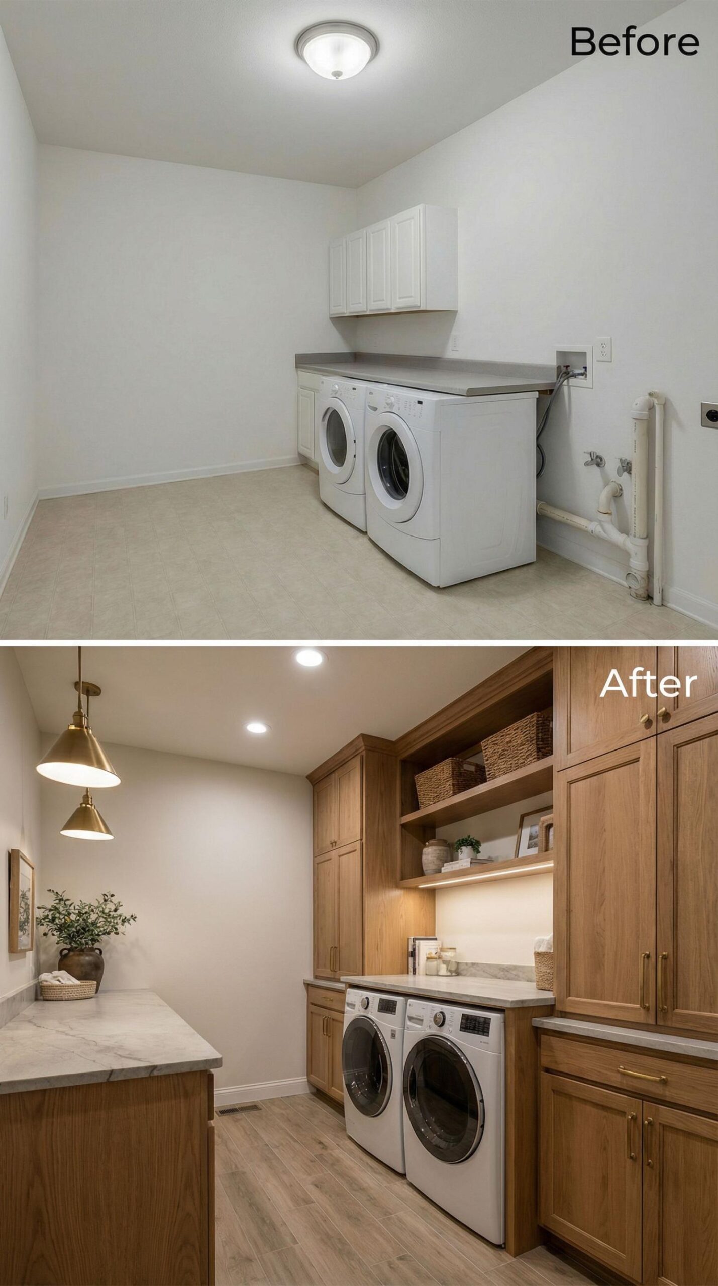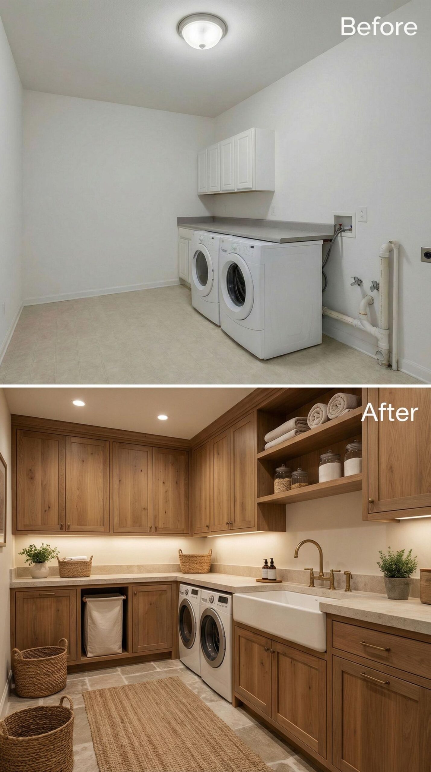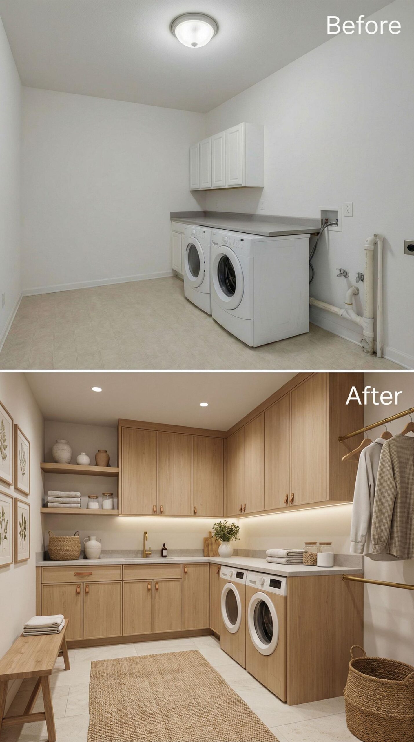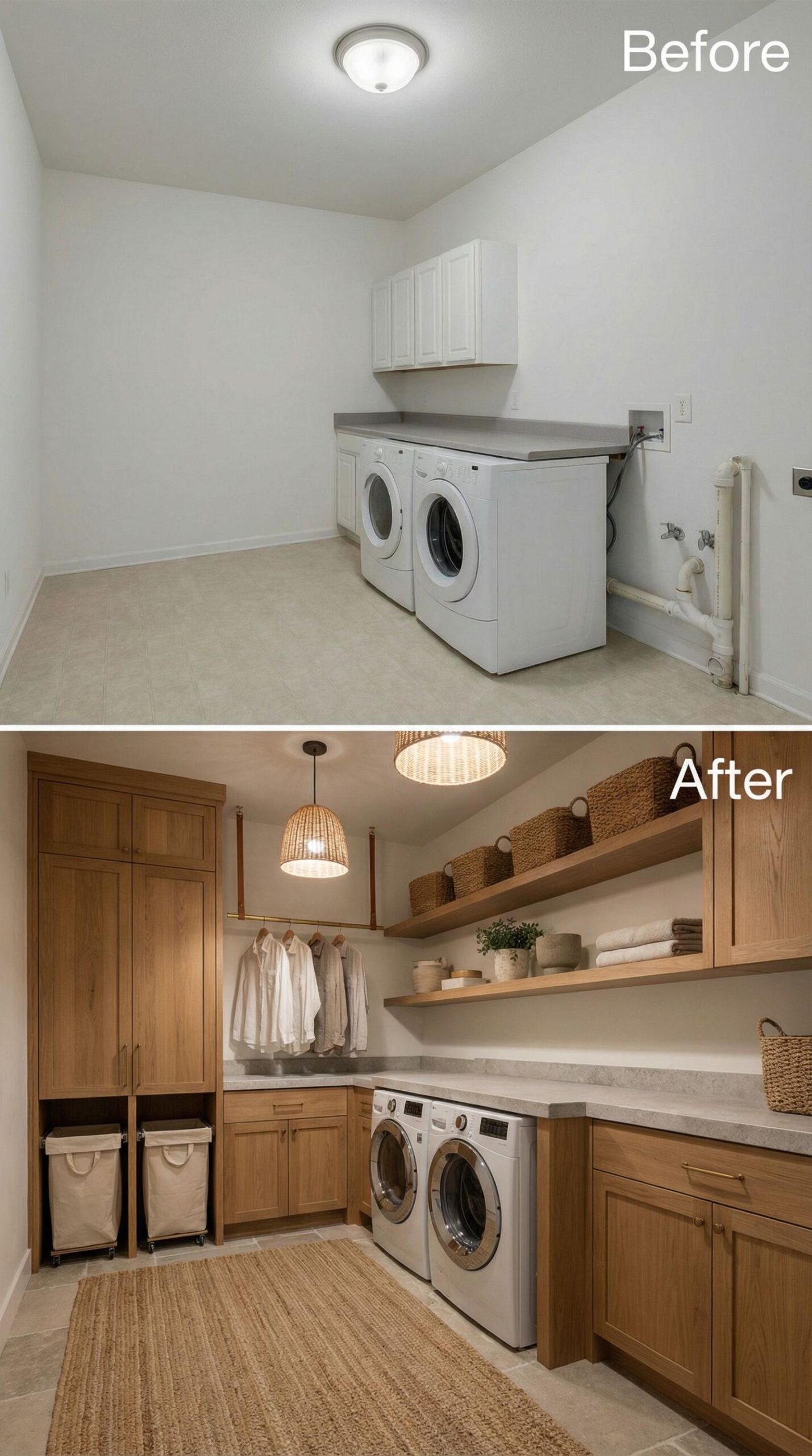 From Builder-Grade Basics to Warm Wood Laundry Sanctuary