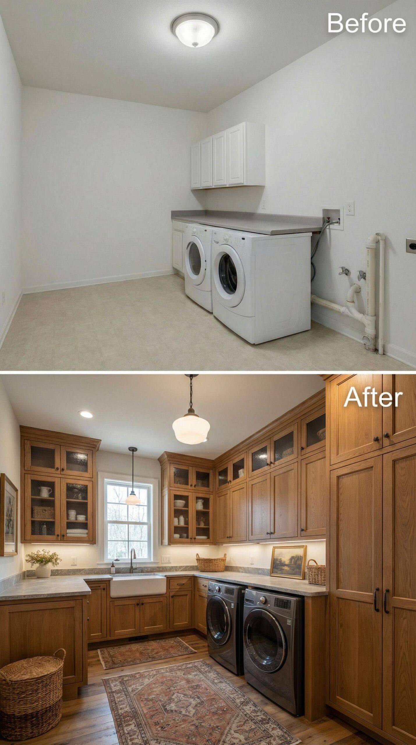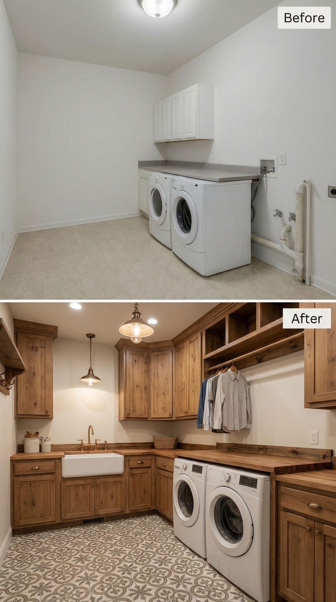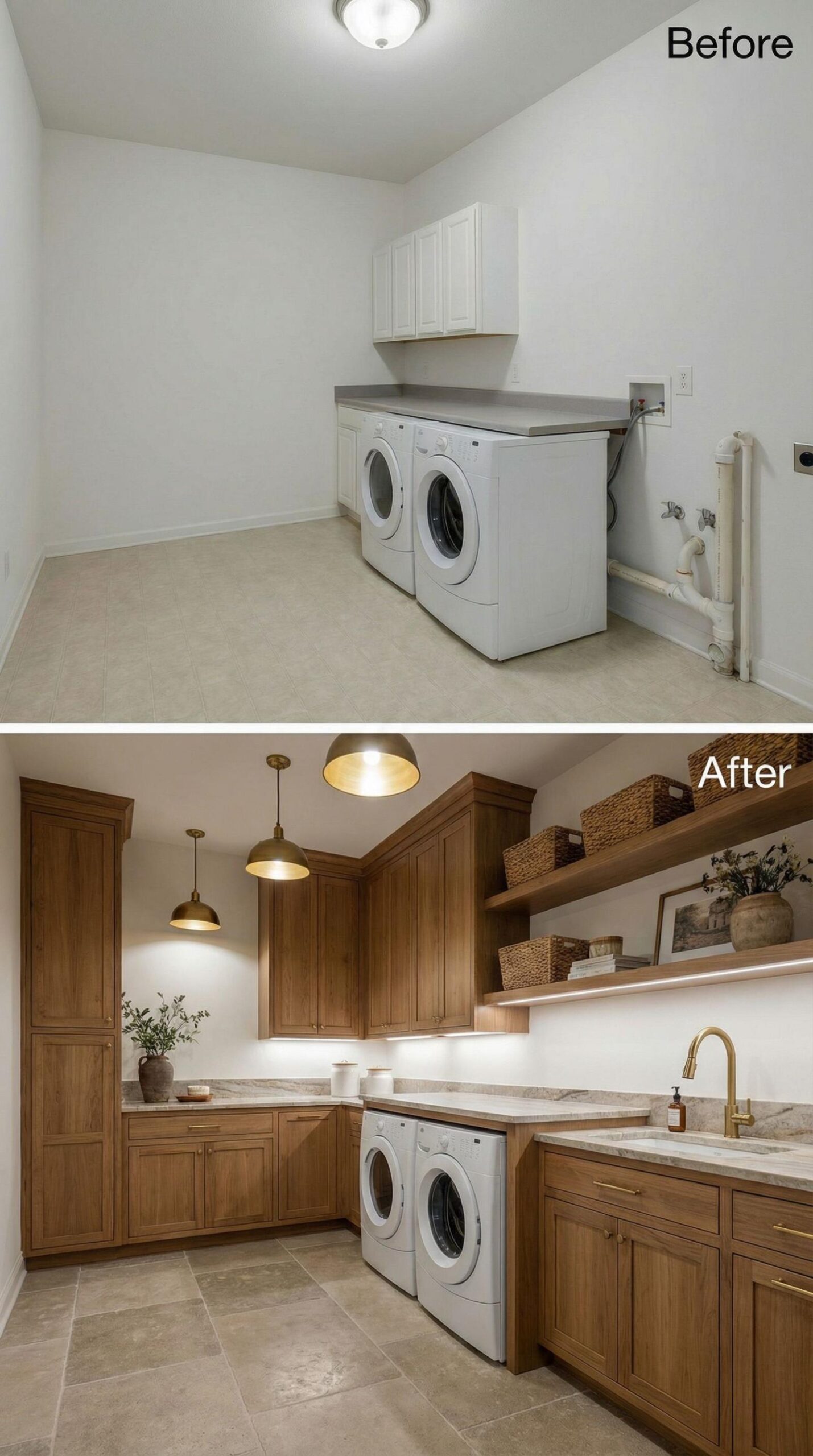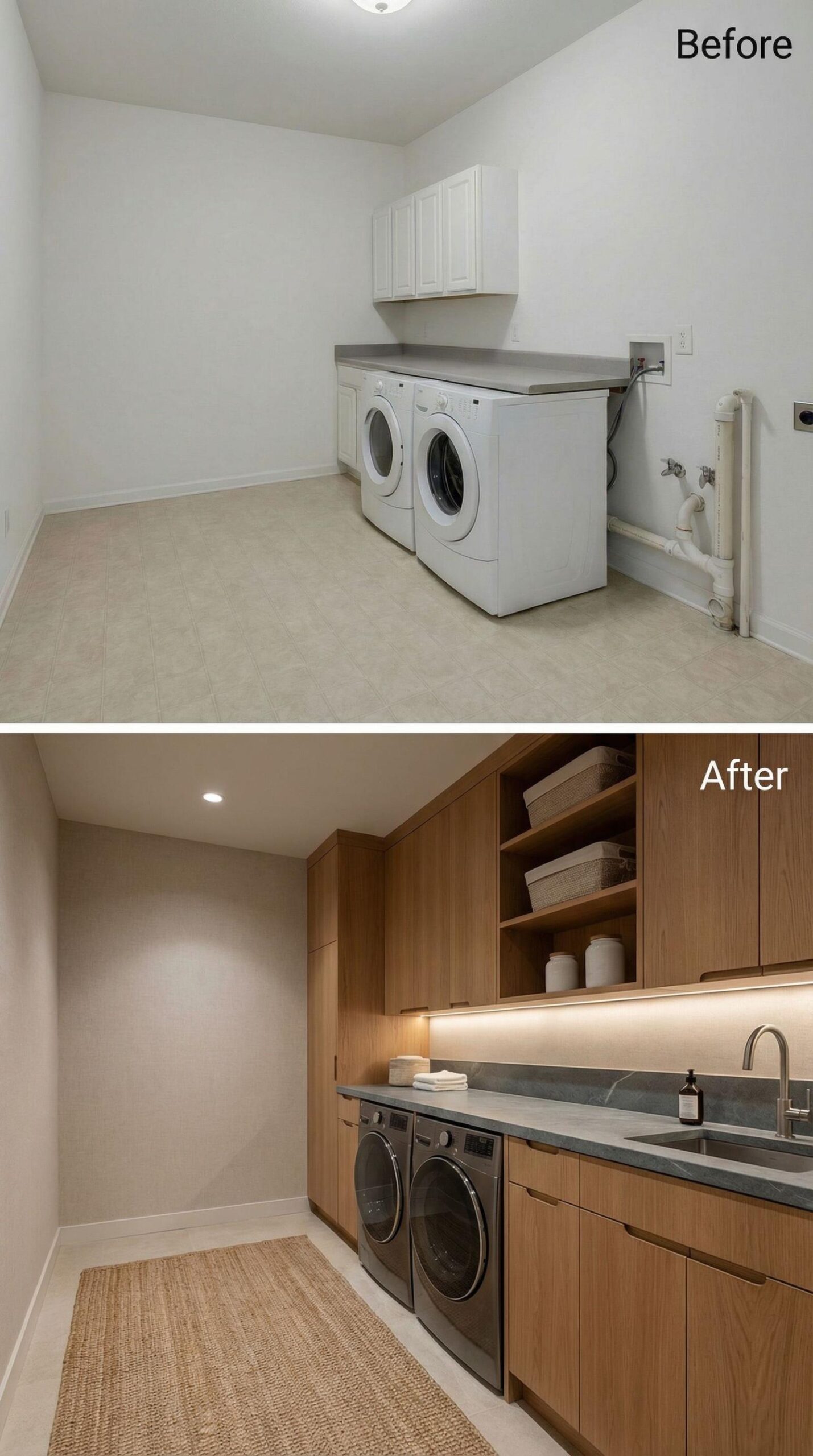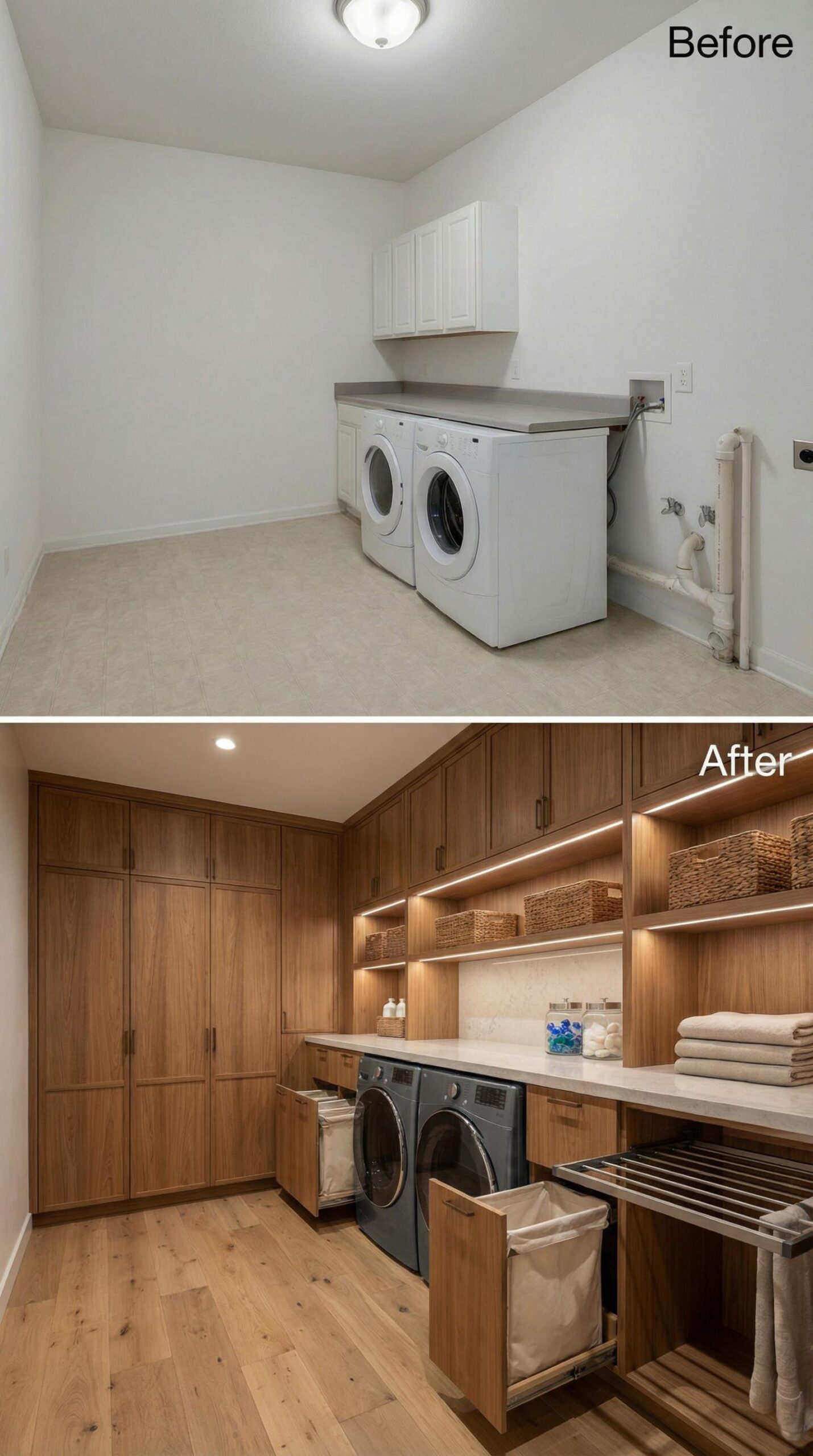 From Builder-Grade Basics to Warm Wood Laundry Sanctuary