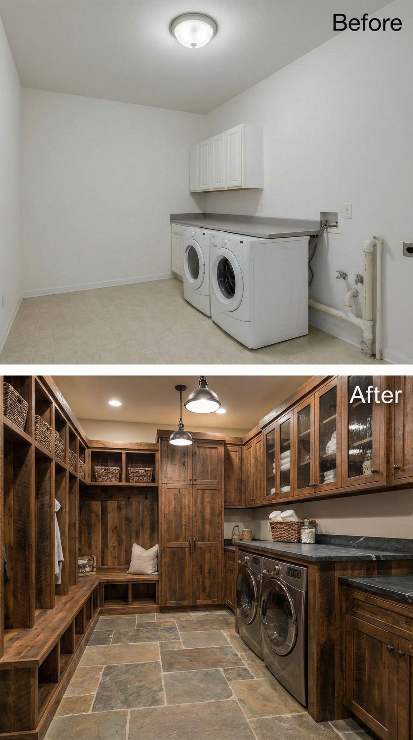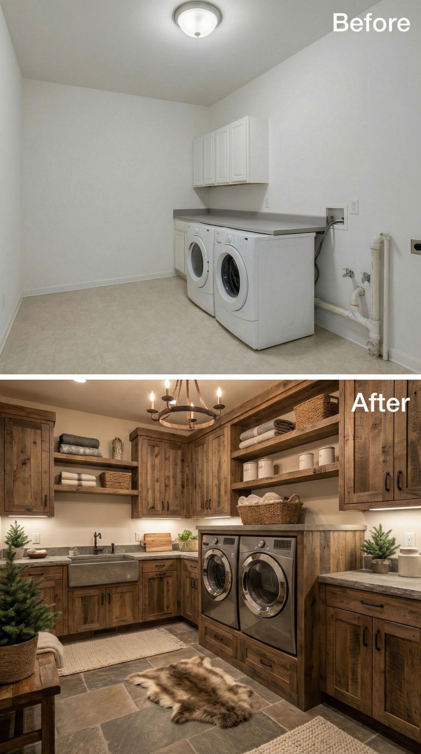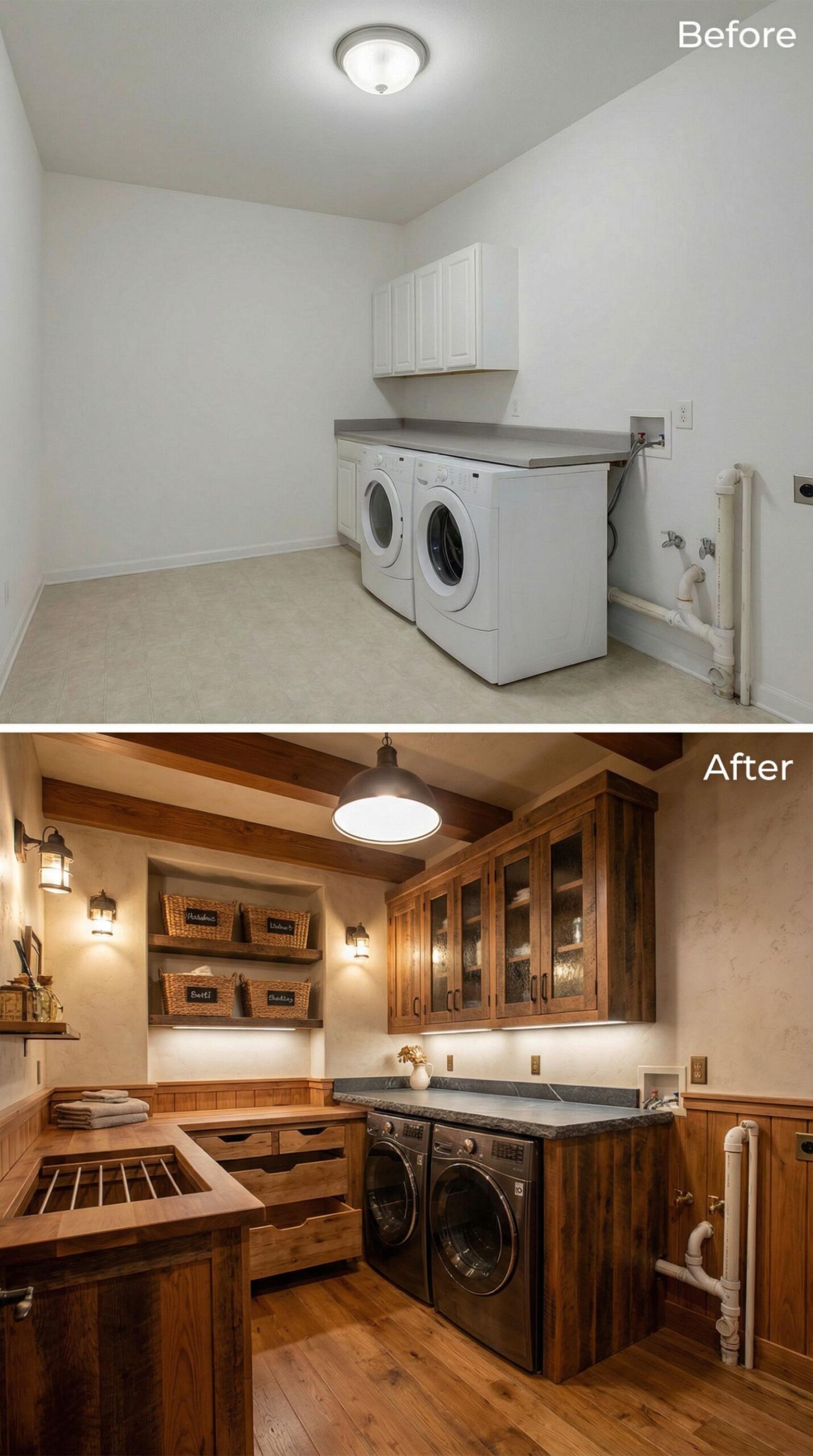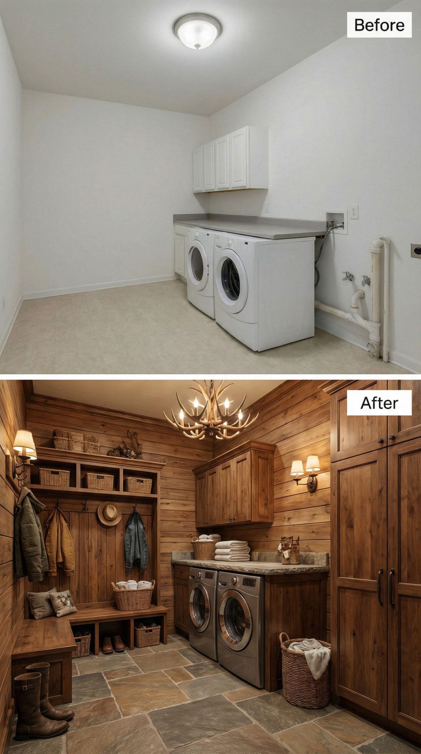 From Builder-Grade Bland to Rustic Lodge-Style Luxury Laundry Haven