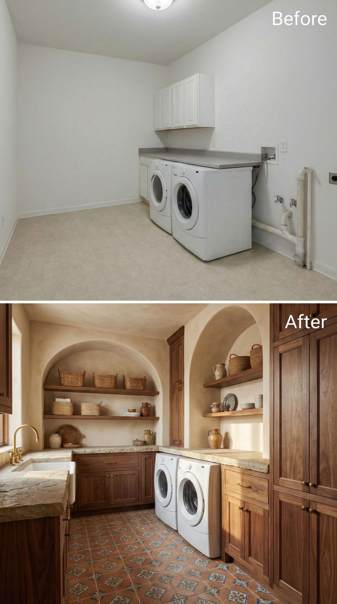 Rich walnut cabinetry and warm terracotta tiles completely transform this builder-grade laundry room into a Mediterranean-style retreat. Arched niches create elegant display storage for woven baskets and ceramic vessels, while natural stone countertops and a farmhouse sink elevate everyday functionality. Brass fixtures and earthy wall tones complete the luxurious European-inspired aesthetic.