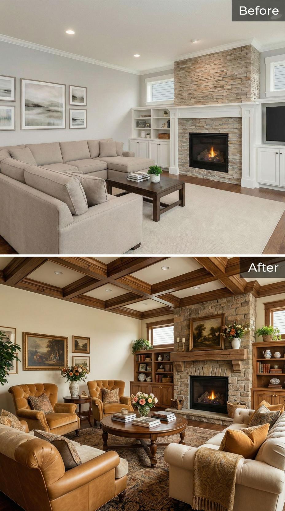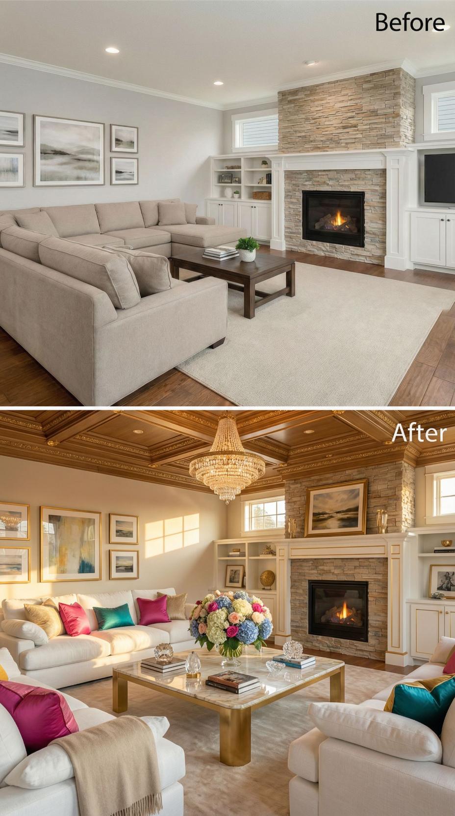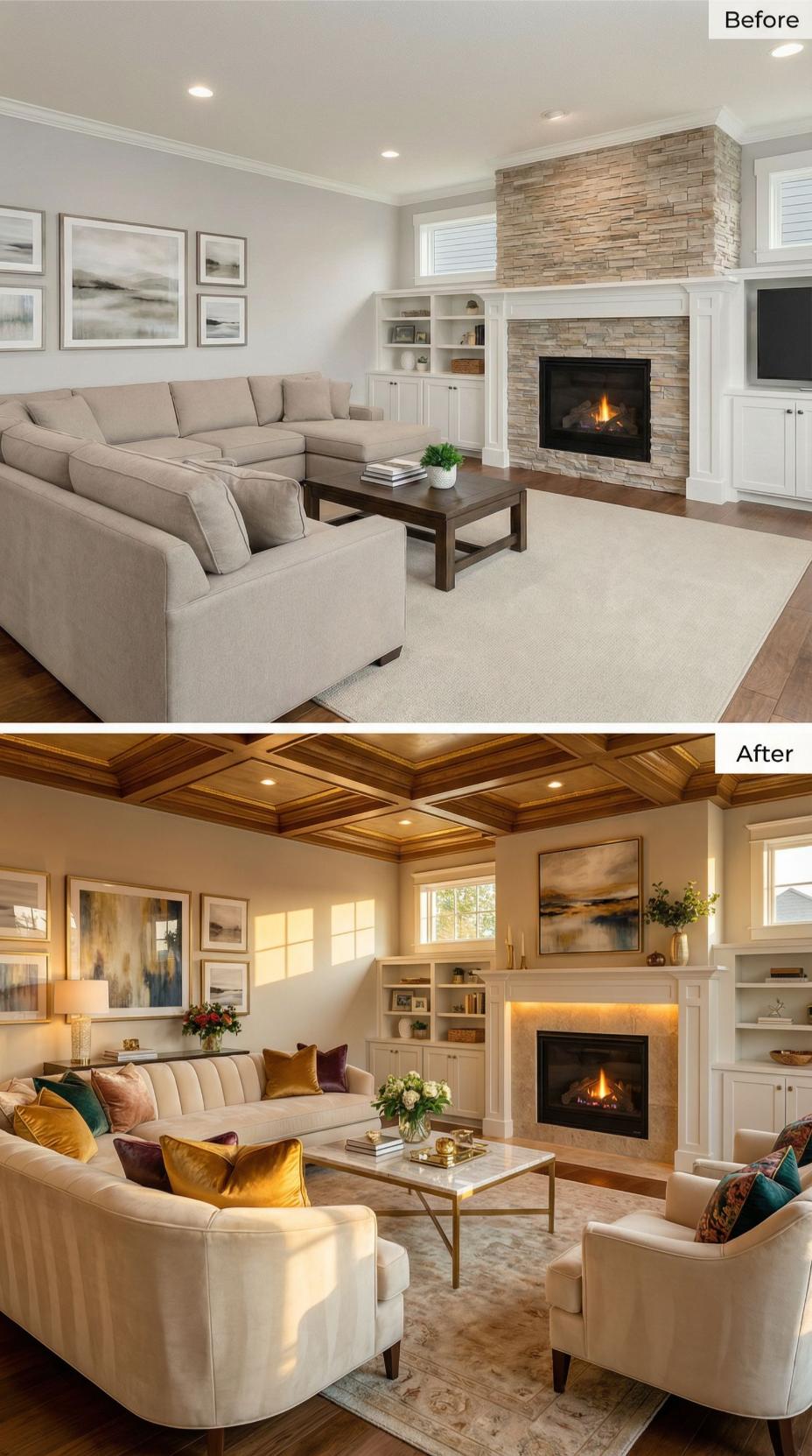 Warm golden lighting transforms this builder-grade living room into a sophisticated retreat through an ornate coffered ceiling and strategic furniture repositioning. Jewel-toned velvet pillows in mustard and burgundy replace bland neutrals, while curved upholstered chairs create intimate conversation areas. The stone fireplace gains prominence with under-mantel lighting, and layered artwork adds visual depth to previously stark walls.
