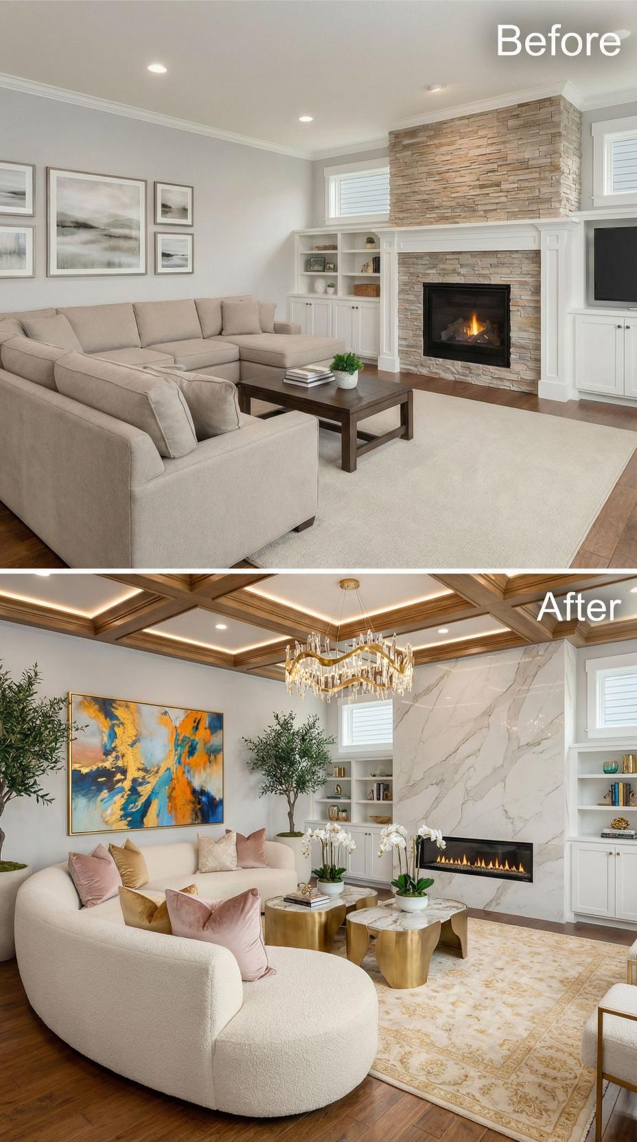 Rich coffered ceilings with integrated LED lighting replace the plain flat surface, while a dramatic white marble fireplace surround transforms the basic stone facade. Gold metallic accents throughout the refreshed space elevate the neutral palette, complemented by curved contemporary seating and vibrant abstract artwork that commands attention on the refined wall gallery.