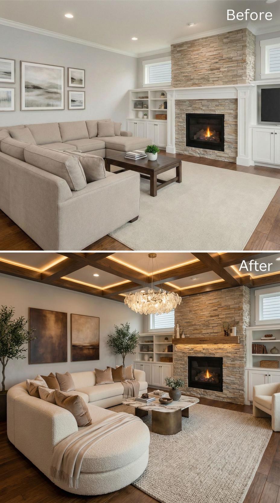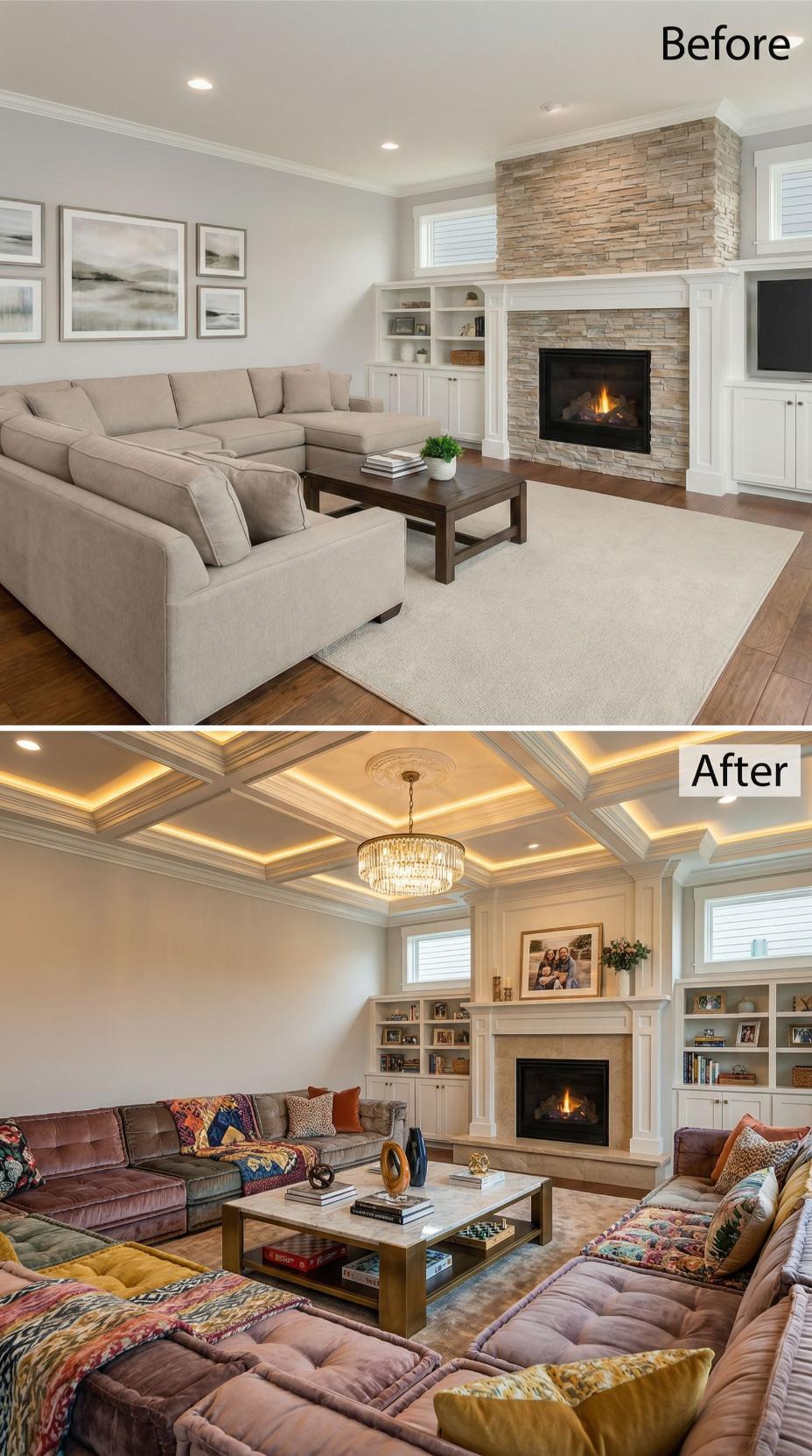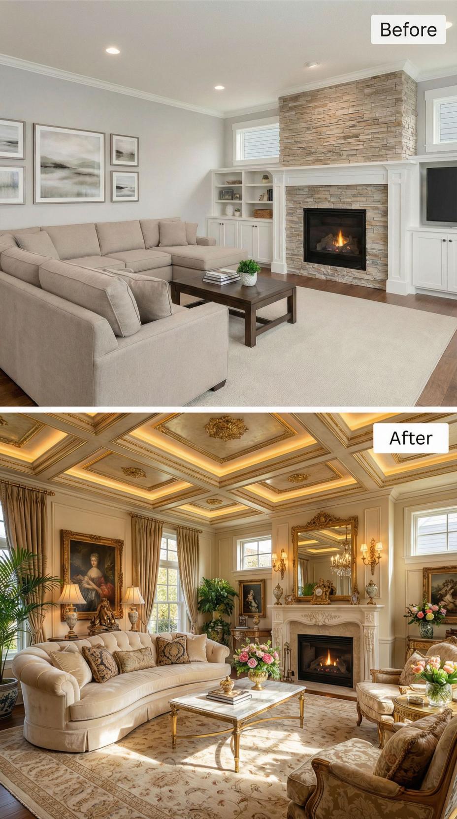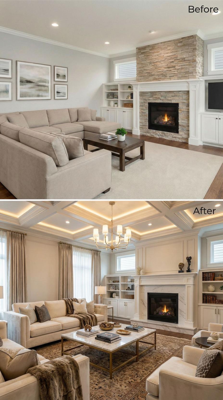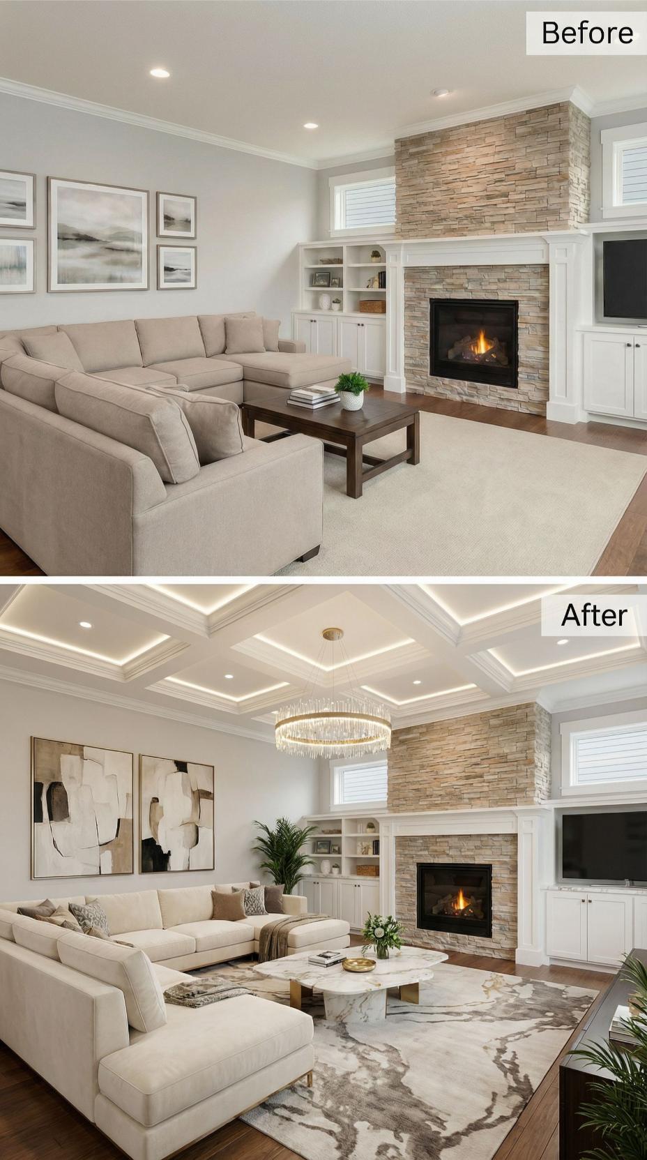 Builder-grade Living Rooms for Happy People transform dramatically when architectural details take center stage. The renovation replaces basic flat ceilings with elaborate coffered treatments featuring integrated LED strip lighting, while stone fireplace surrounds give way to elegant white marble. Rich area rugs, luxurious drapery panels, and a statement chandelier elevate the space from standard to spectacular sophistication.