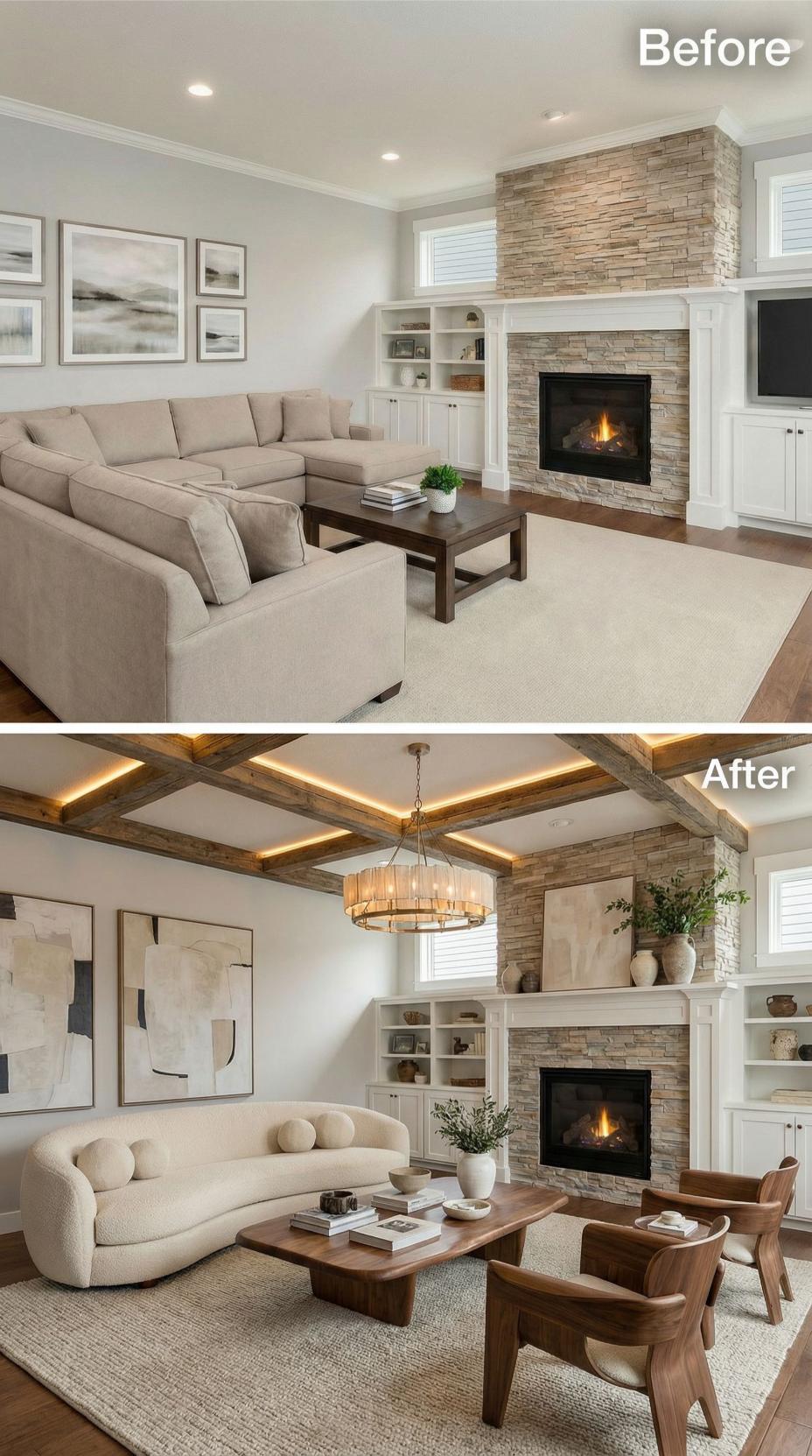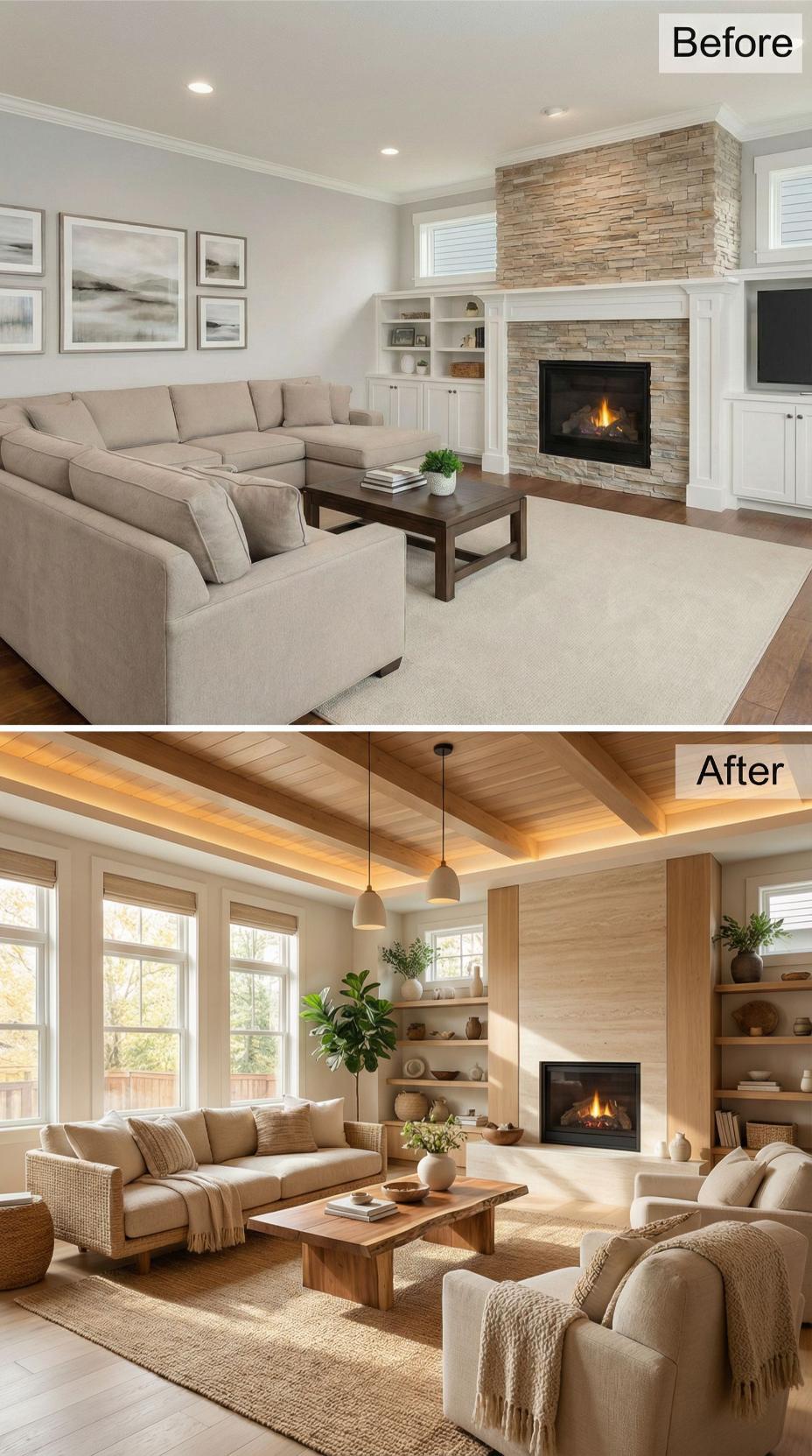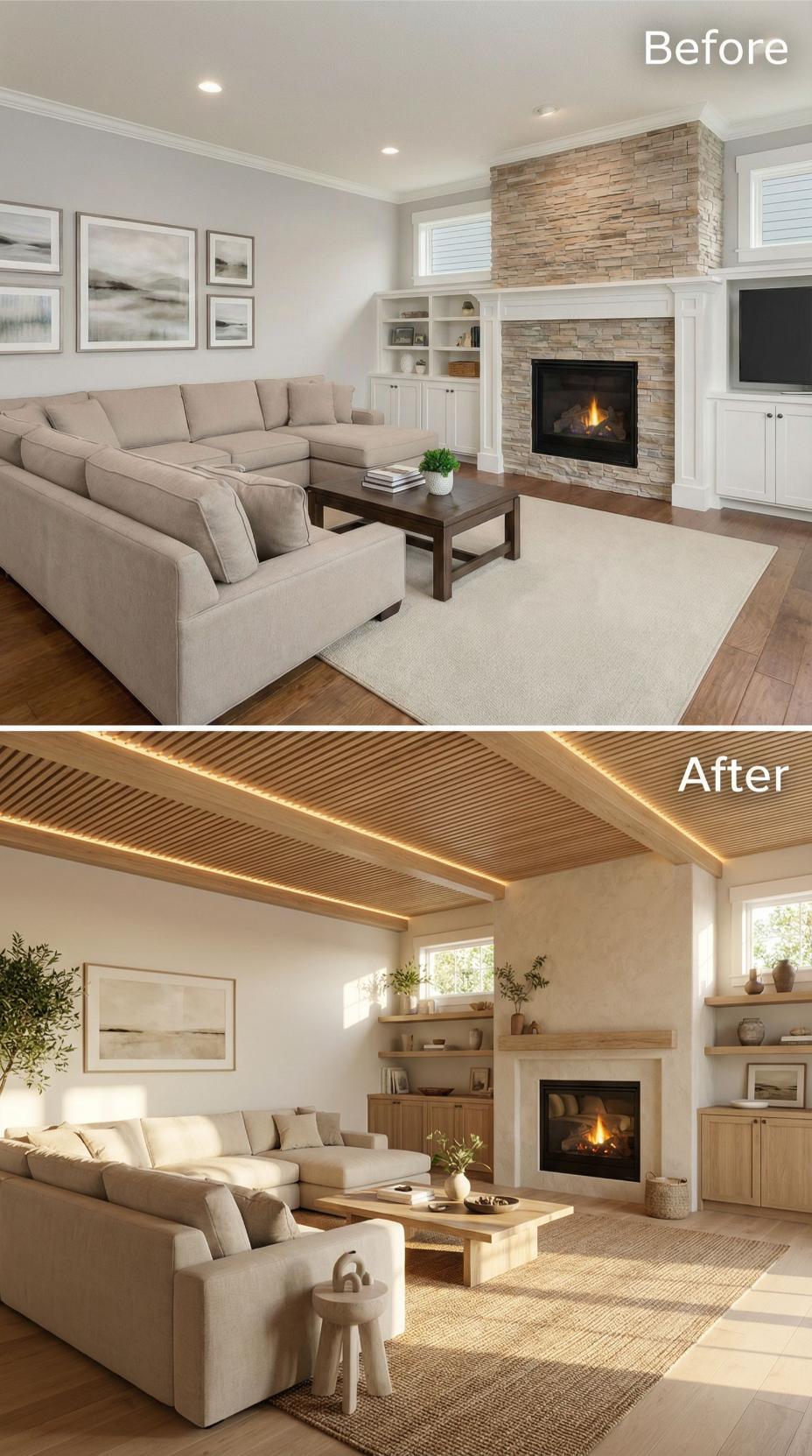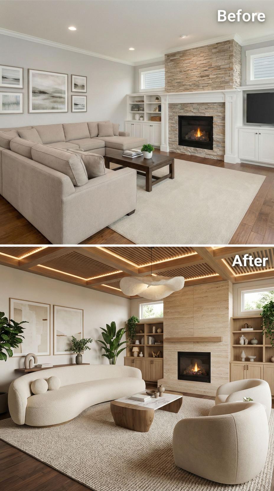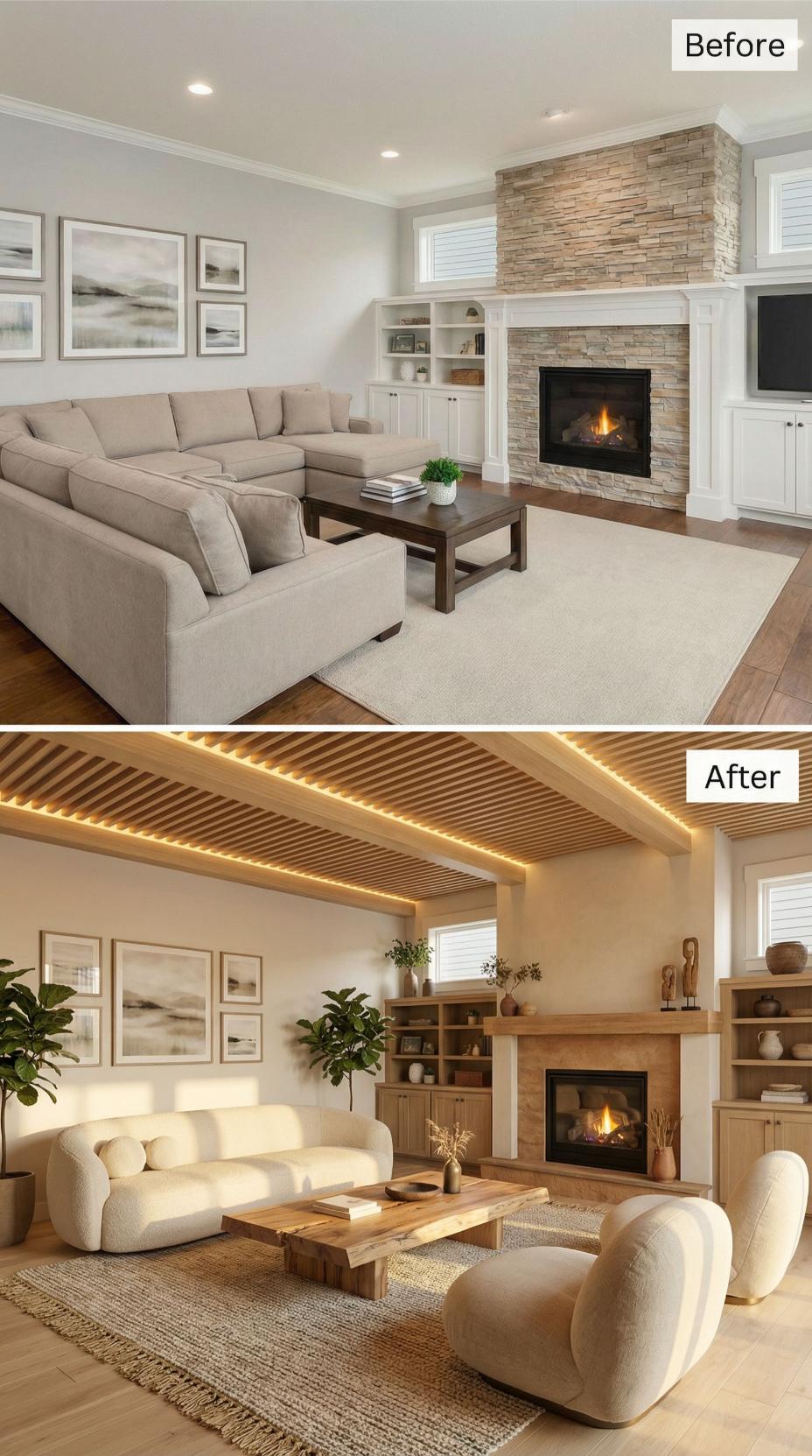 Natural wood ceiling beams with integrated LED strip lighting replace standard drywall, creating dramatic architectural interest and ambient illumination. The stone fireplace transforms into a sleek wood-clad focal point, while built-in oak shelving replaces basic white cabinetry. Curved ivory bouclé seating and a live-edge coffee table complete the organic modernist transformation.