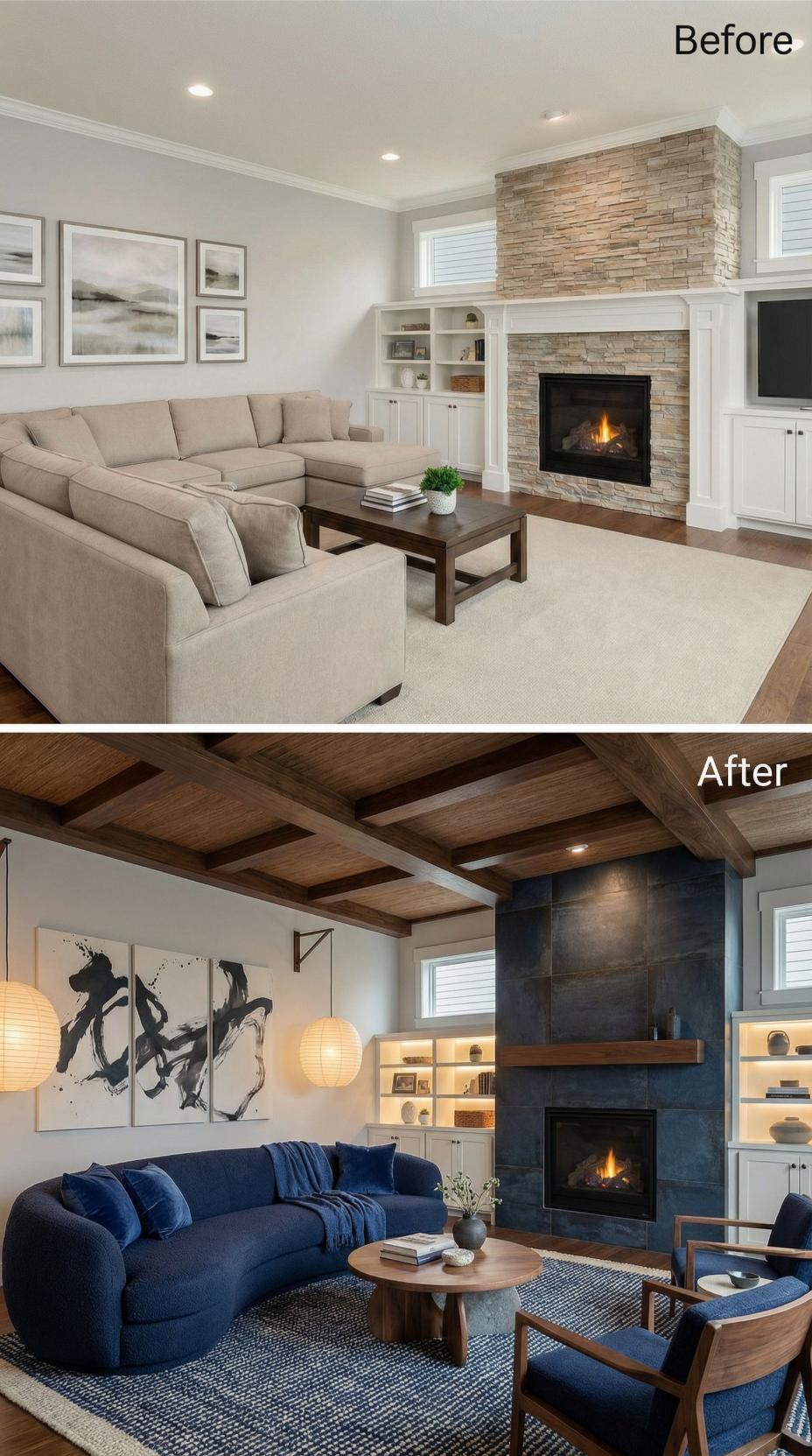 Navy blue transforms this builder-grade living room from predictable beige into a sophisticated retreat. Exposed wooden ceiling beams replace flat white surfaces while a dramatic slate tile fireplace surround commands attention. Contemporary black and white abstract art energizes neutral walls, and pendant lighting creates intimate ambiance. Rich navy upholstery paired with warm wood tones establishes a refined, masculine aesthetic.