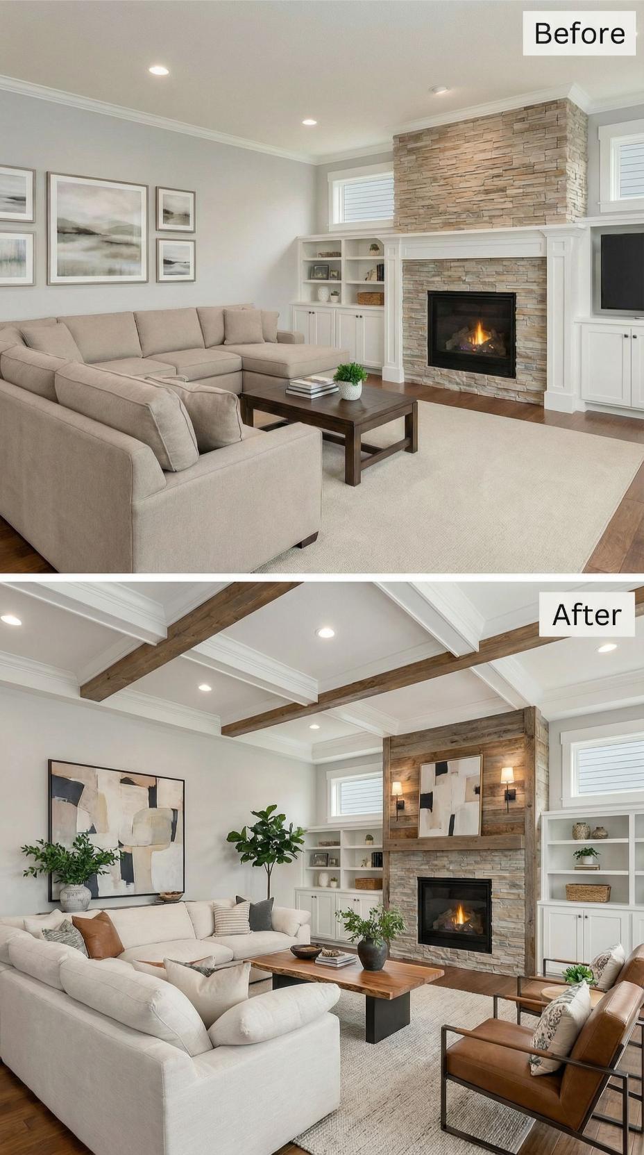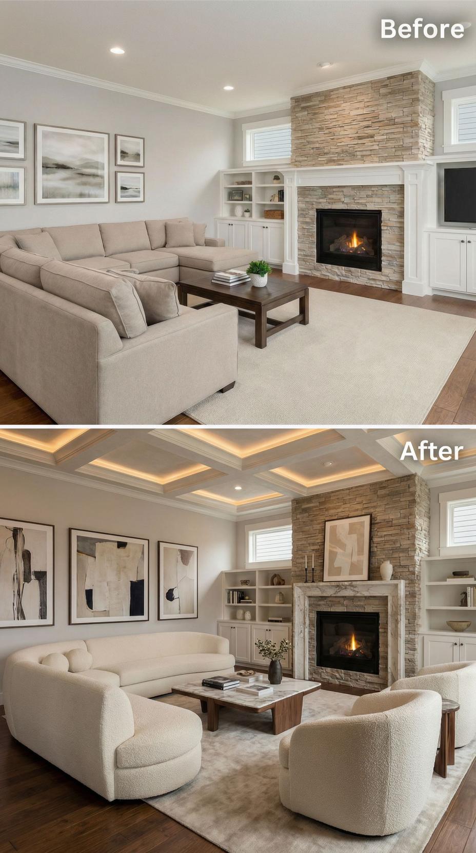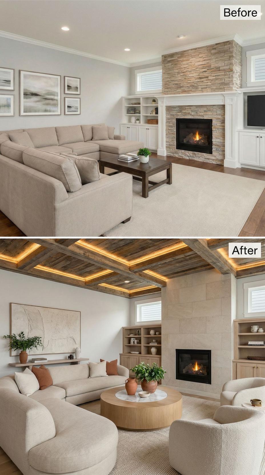 Dramatic exposed wood beams with integrated LED strip lighting replace a flat ceiling, instantly elevating this neutral space. The stone fireplace gains a sleek makeover with large-format porcelain tiles, while built-in cabinetry in warm wood tones provides sophisticated storage. Curved seating and a round coffee table soften the angular architecture, creating an inviting conversation area perfect for entertaining.