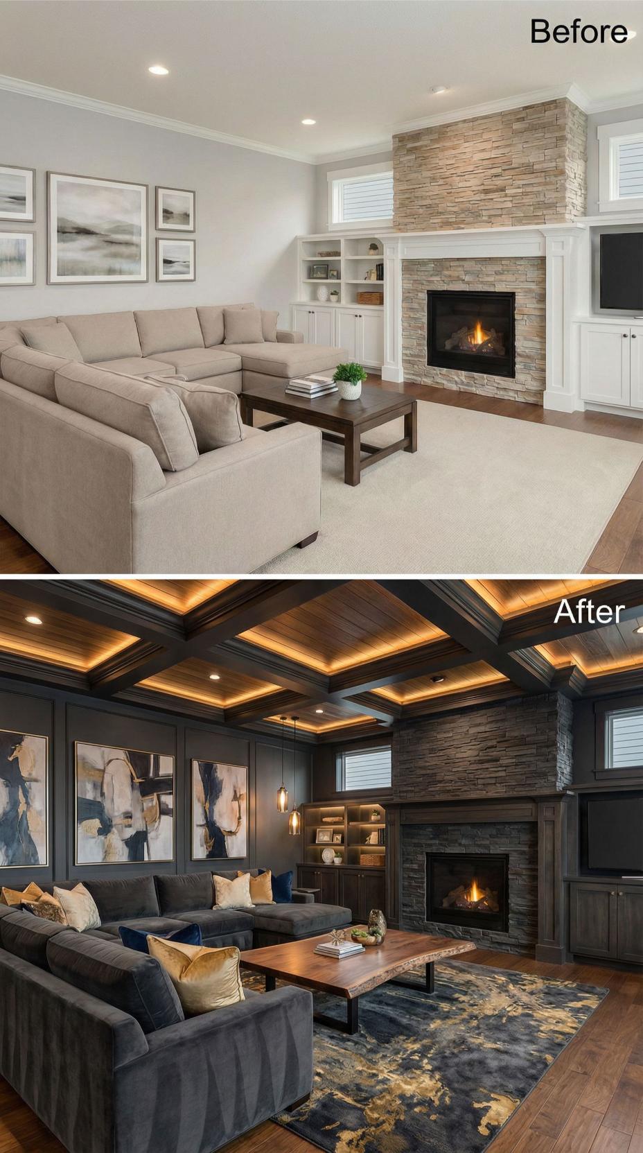 Dramatic charcoal walls and an elaborate coffered ceiling with warm LED lighting transformed this builder-grade living room into a sophisticated masculine retreat. Dark velvet sectional seating replaces the bland beige furniture, while rich wood tones throughout the built-ins and coffee table create warmth. Abstract artwork and pendant lighting elevate the space from generic to genuinely luxurious.