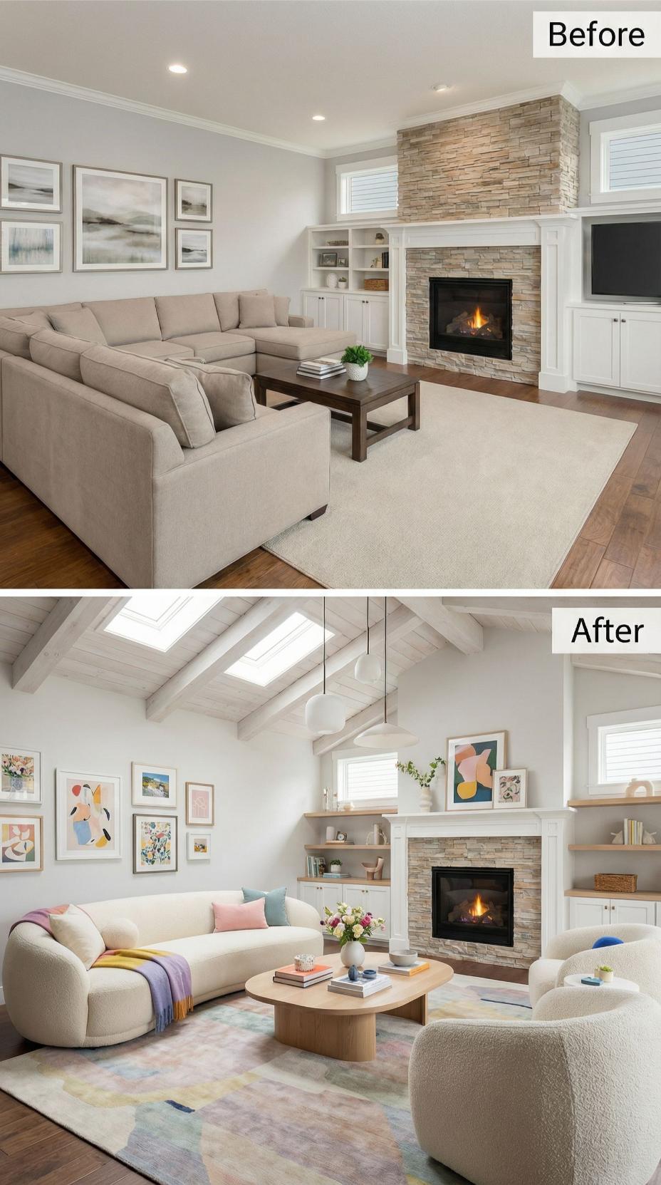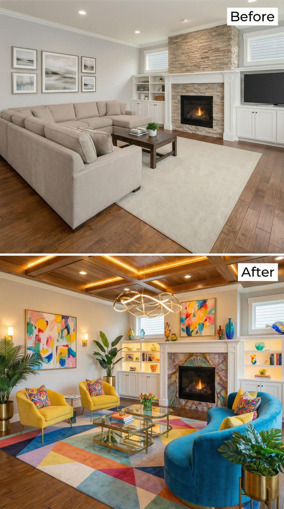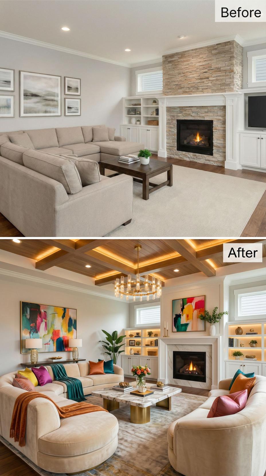 Bold geometric artwork and rich jewel-toned pillows transform this formerly neutral builder-grade living room into an energetic gathering space. Exposed wooden ceiling beams with integrated LED lighting replace basic recessed fixtures, while colorful abstract art replaces generic landscape prints. The original stone fireplace remains, but updated built-in shelving with warm accent lighting showcases curated decorative objects instead of sparse basic storage.