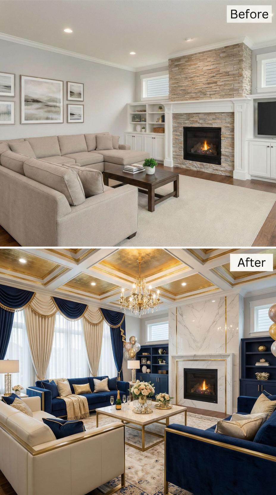 Dramatic navy velvet sectional seating replaces the beige builder-grade sofa, while an elaborate coffered ceiling with warm LED lighting transforms the flat overhead plane. The stone fireplace gains striking black marble surround treatment, and metallic gold accents through geometric coffee tables and picture frames elevate the space from basic to luxurious.