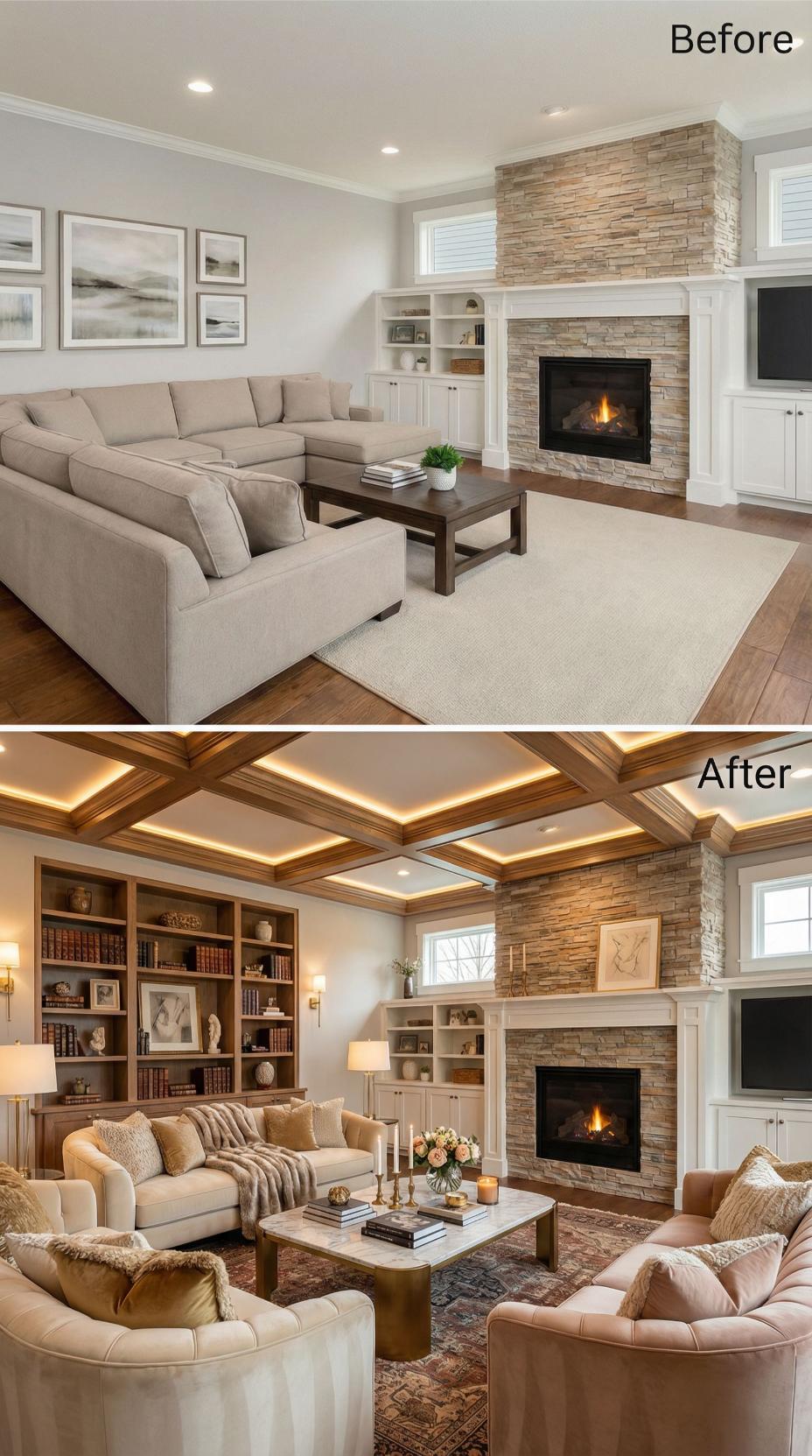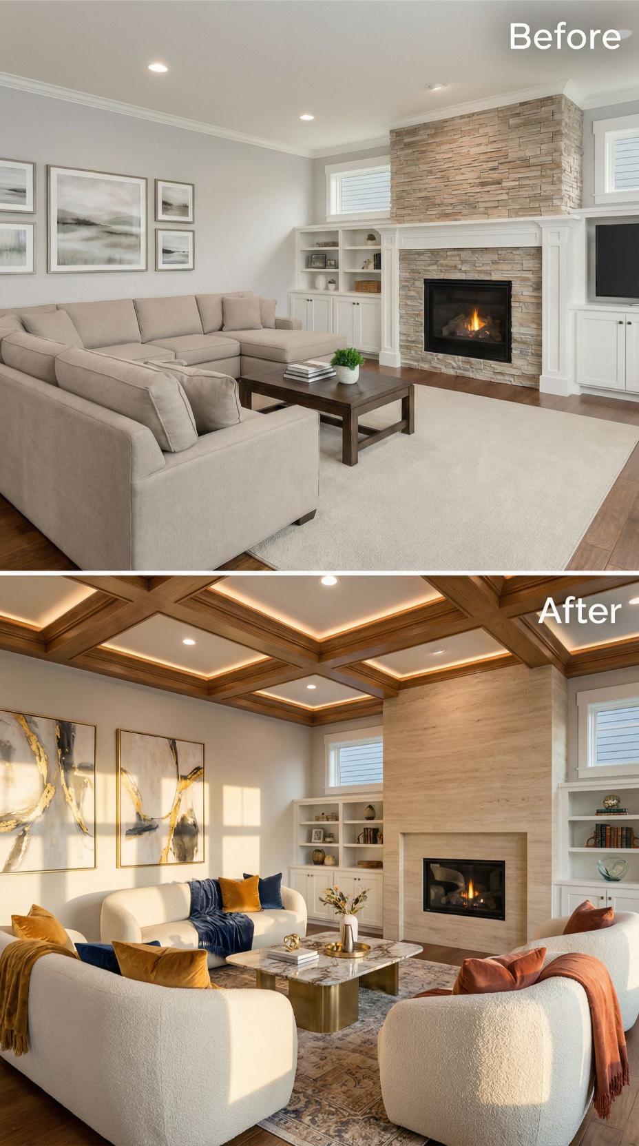 Dramatic coffered ceiling treatment with integrated LED strip lighting transforms this builder-grade living room into an upscale sanctuary. Rich walnut wood beams create geometric depth while warm accent lighting adds sophisticated ambiance. The fireplace receives a sleek marble surround upgrade, complemented by jewel-tone velvet seating and abstract metallic artwork that replaces generic wall decor.