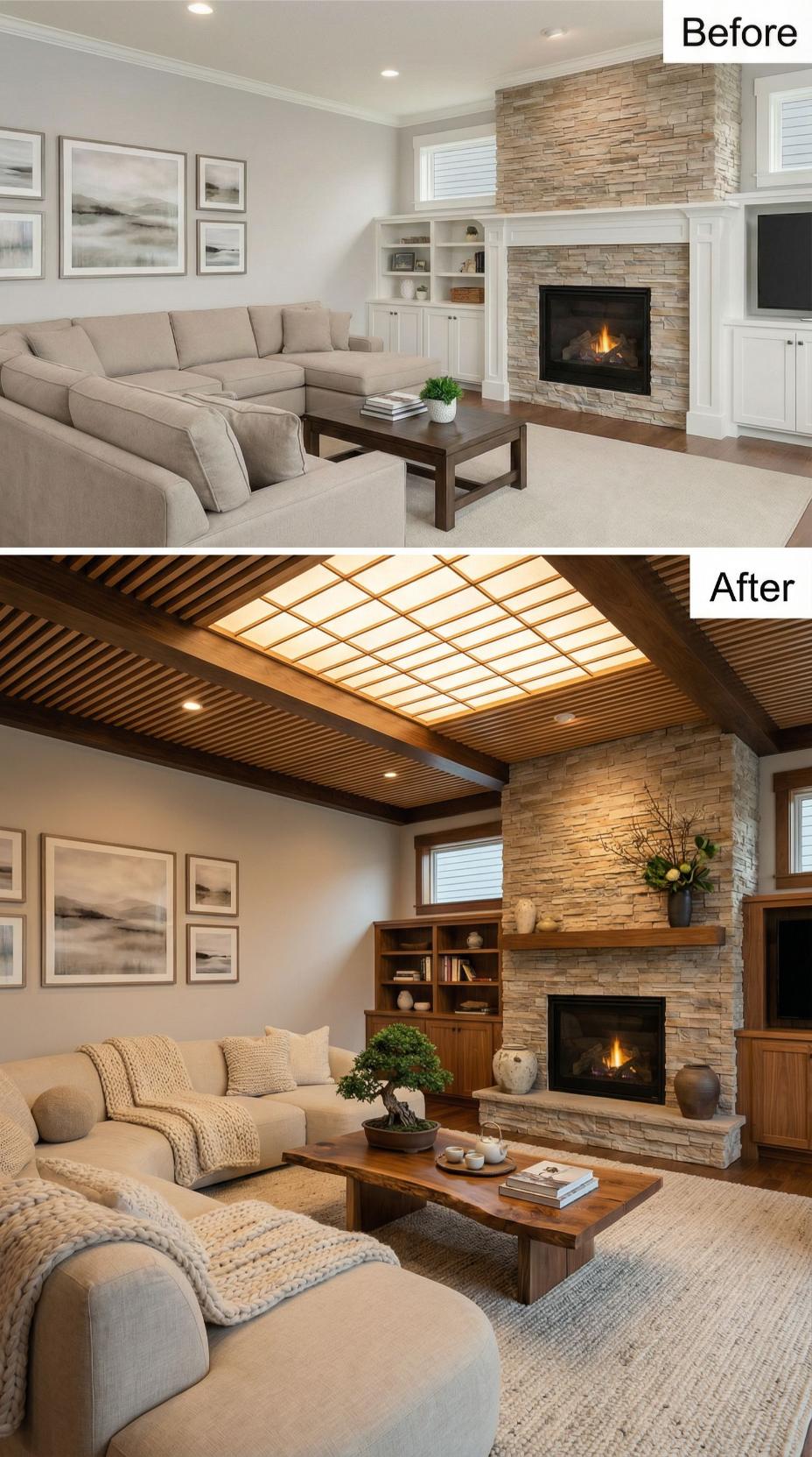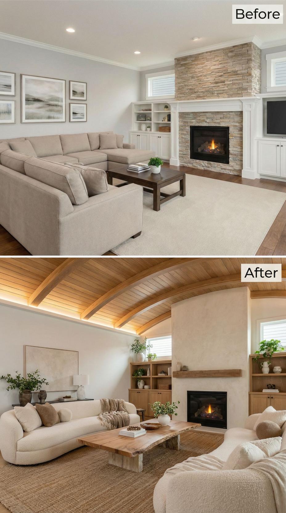 Builder-grade Living Rooms for Happy People receive dramatic upgrades through natural wood ceilings and streamlined fireplace design. The transformation eliminates heavy stone textures in favor of sleek wood paneling, while exposed ceiling beams create architectural interest. Woven textures and organic materials replace formal furnishings, establishing a relaxed yet sophisticated atmosphere. Strategic lighting and open shelving complete this modern sanctuary.