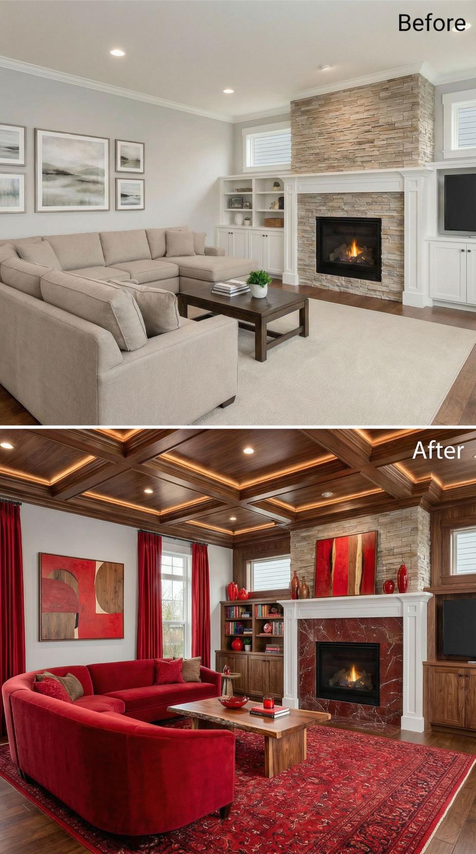 Rich walnut coffered ceilings with warm LED uplighting transform this builder-grade living room into a luxurious retreat. The neutral beige sectional gives way to sumptuous red velvet seating that commands attention against crisp white walls. Stone fireplace surround gains dramatic impact with deep red marble, while built-in cabinetry shifts from painted white to rich walnut wood tones that echo the architectural ceiling treatment above.