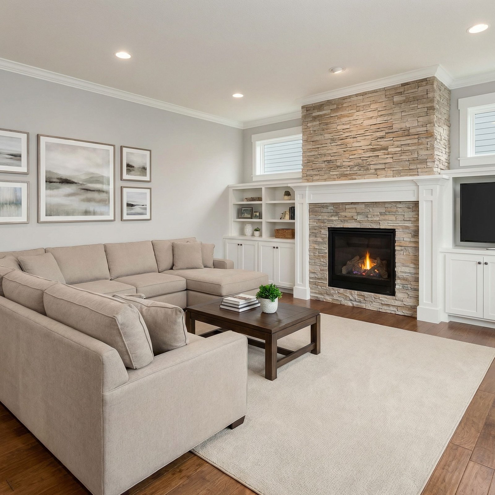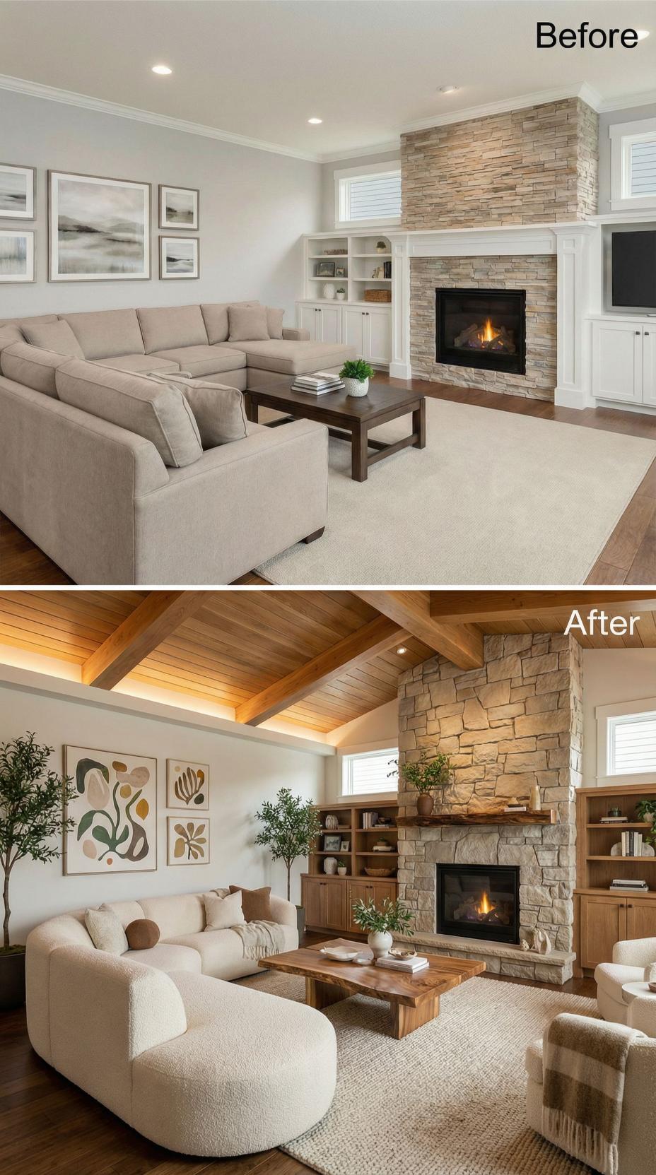 Exposed wood beam ceilings with integrated lighting transform this builder-grade living room into a sophisticated retreat. Natural stone fireplace extends to the ceiling while warm wood built-ins replace standard white cabinetry. Curved sectional seating creates intimate conversation areas, complemented by organic botanical artwork and layered neutral textiles that soften the architectural drama.