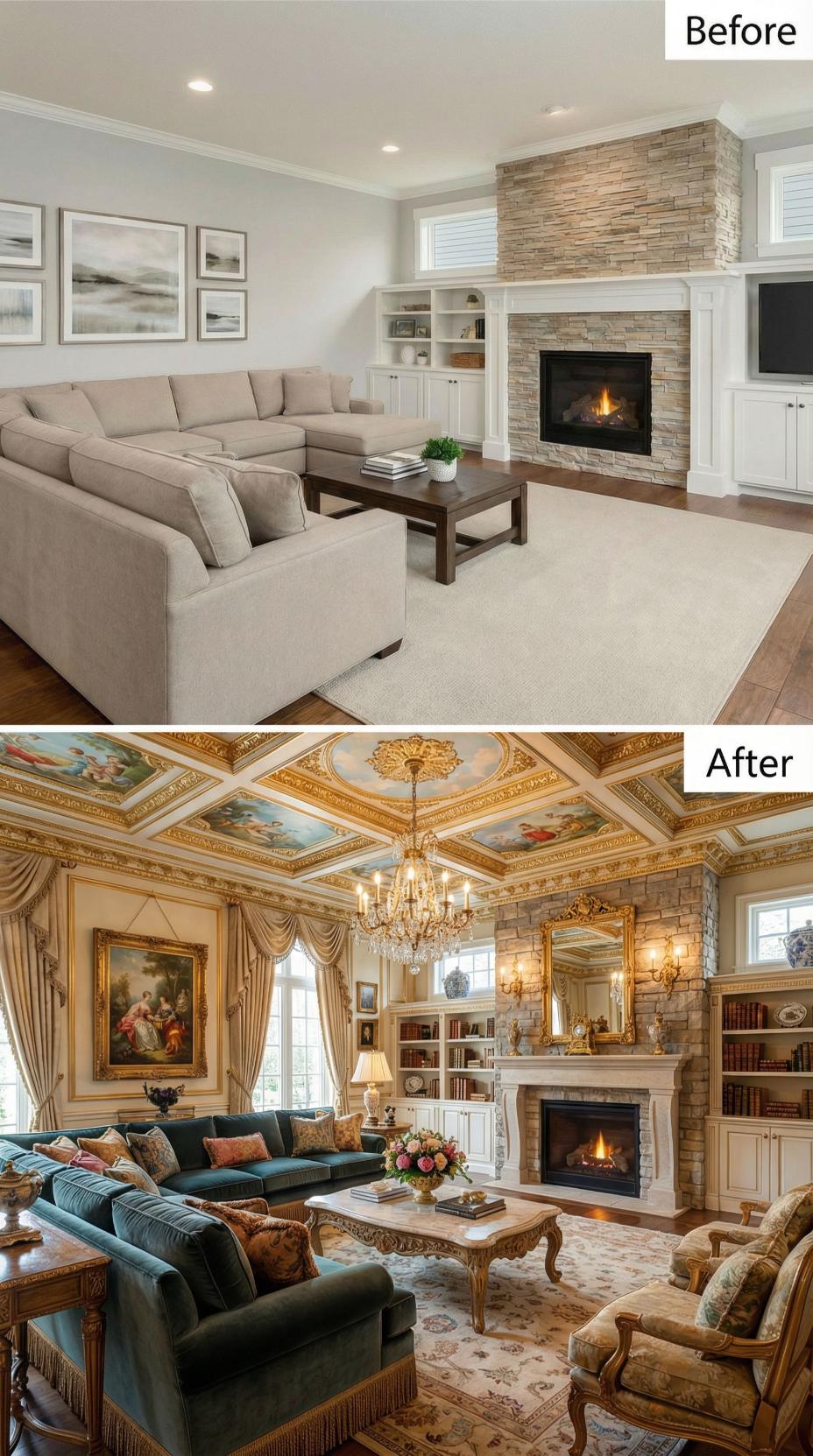 Elaborate coffered ceilings with hand-painted frescoes and gold leafing replace simple recessed lighting in this dramatic transformation. The builder-grade neutral sofa gives way to rich teal velvet seating arranged around an ornate carved coffee table. Crystal chandeliers, gilded mirrors, and classical oil paintings complete the opulent European-inspired makeover that elevates basic built-ins into a sophisticated library setting.