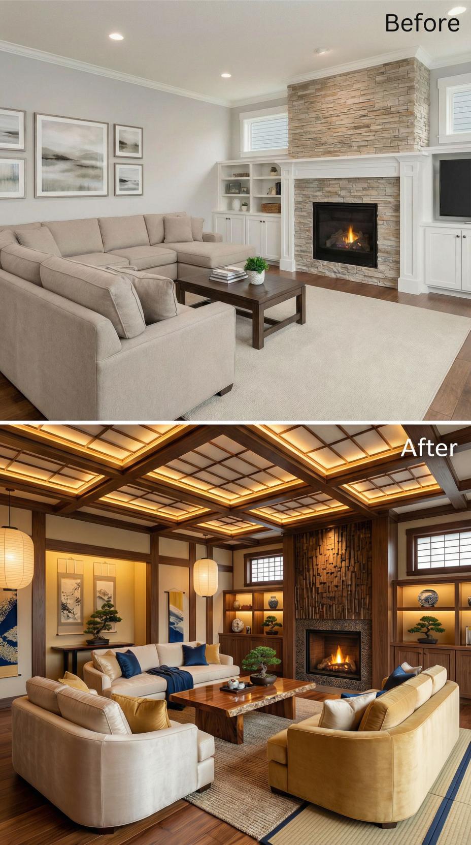 Warm honey oak beam ceiling and rich walnut built-ins replace basic builder-grade elements in this stunning transformation. Paper lantern pendant lights and illuminated display niches create ambient layering while traditional shoji screens add authentic Japanese character. Neutral sectional seating arranged around a live-edge coffee table encourages intimate conversation, while carefully curated bonsai trees and blue accent pillows complete the serene aesthetic.