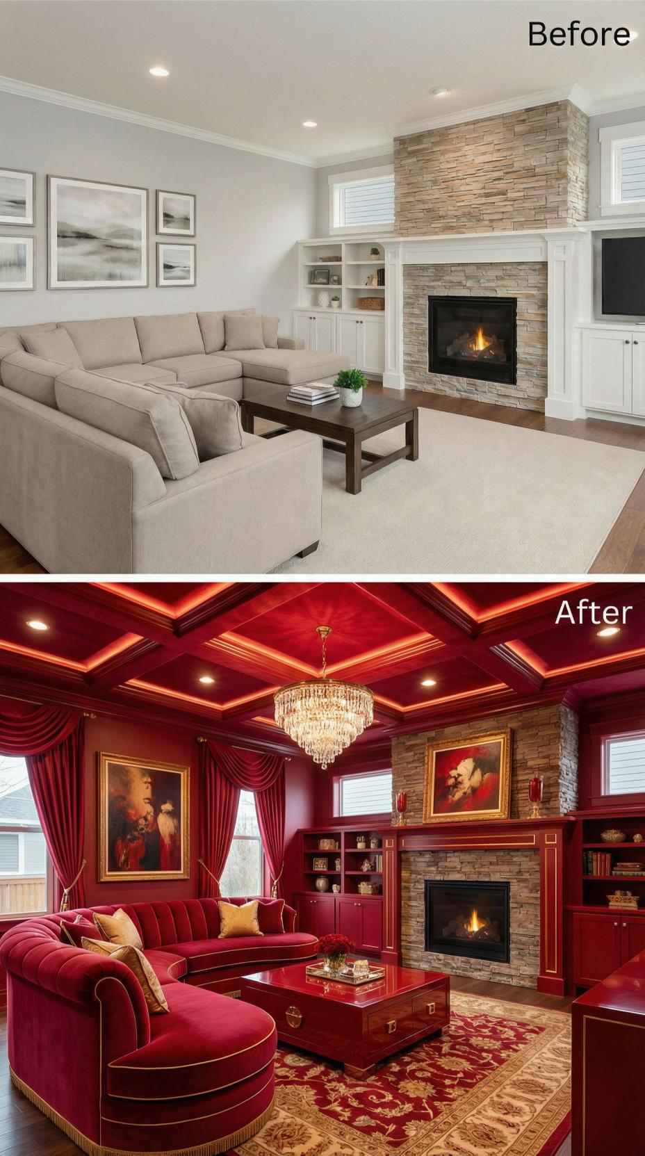 Rich burgundy walls and coffered ceiling transform this builder-grade living room into a luxurious sanctuary worthy of royalty. Deep red velvet seating replaces generic beige furniture, while ornate gold-framed portraits and crystal chandelier elevate the sophistication. Heavy crimson drapery pools dramatically at windows, creating intimate ambiance that contrasts beautifully with the original stone fireplace surround.