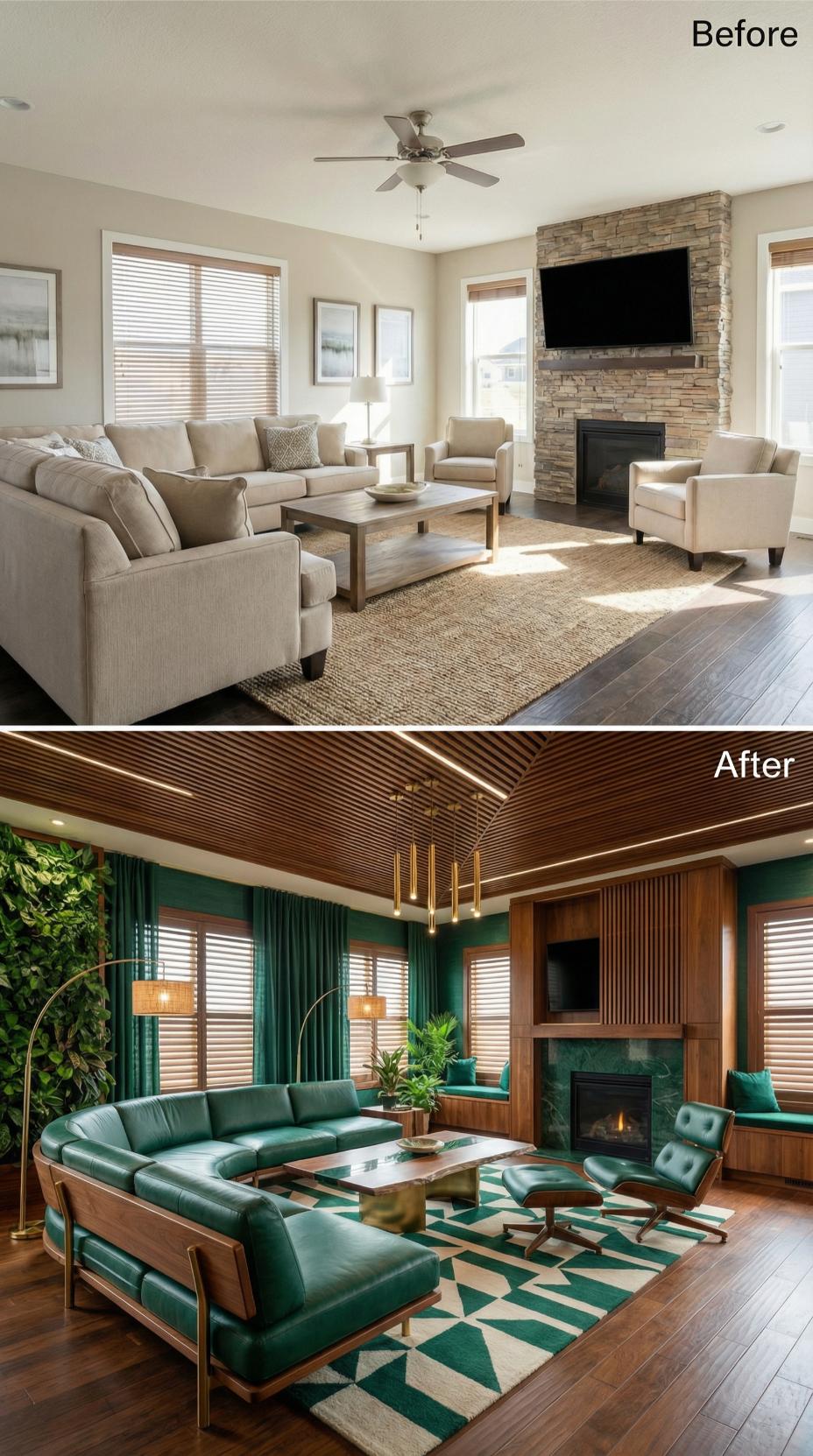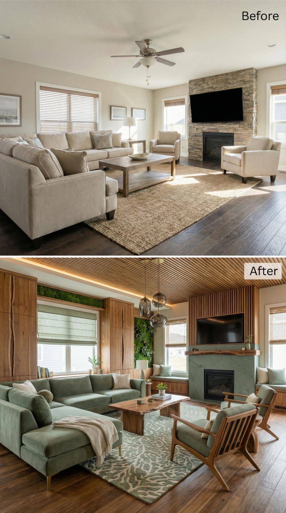 Warm sage green upholstery replaces generic beige seating, while a stunning wood slat ceiling with integrated lighting eliminates the basic ceiling fan. Built-in shelving and window seat storage maximize the introvert’s need for organization, and rich moss-colored artwork adds personality. The stone fireplace gains a sleek TV mount, creating a more streamlined focal point for quiet evenings.