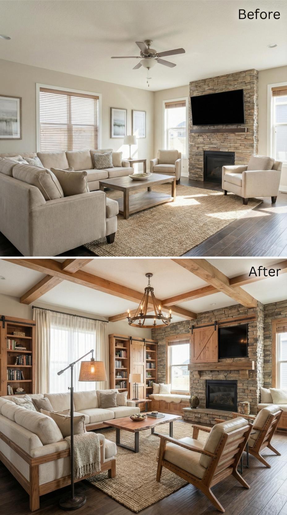 Exposed wooden ceiling beams transform this builder-grade living room for introverts into a cozy rustic sanctuary. Built-in bookshelves replace bland walls, while a barn door adds farmhouse charm beside the existing stone fireplace. The original neutral furniture gains warmth through wooden accents and a statement chandelier. Floor-to-ceiling windows with flowing curtains create an inviting reading nook perfect for quiet contemplation.