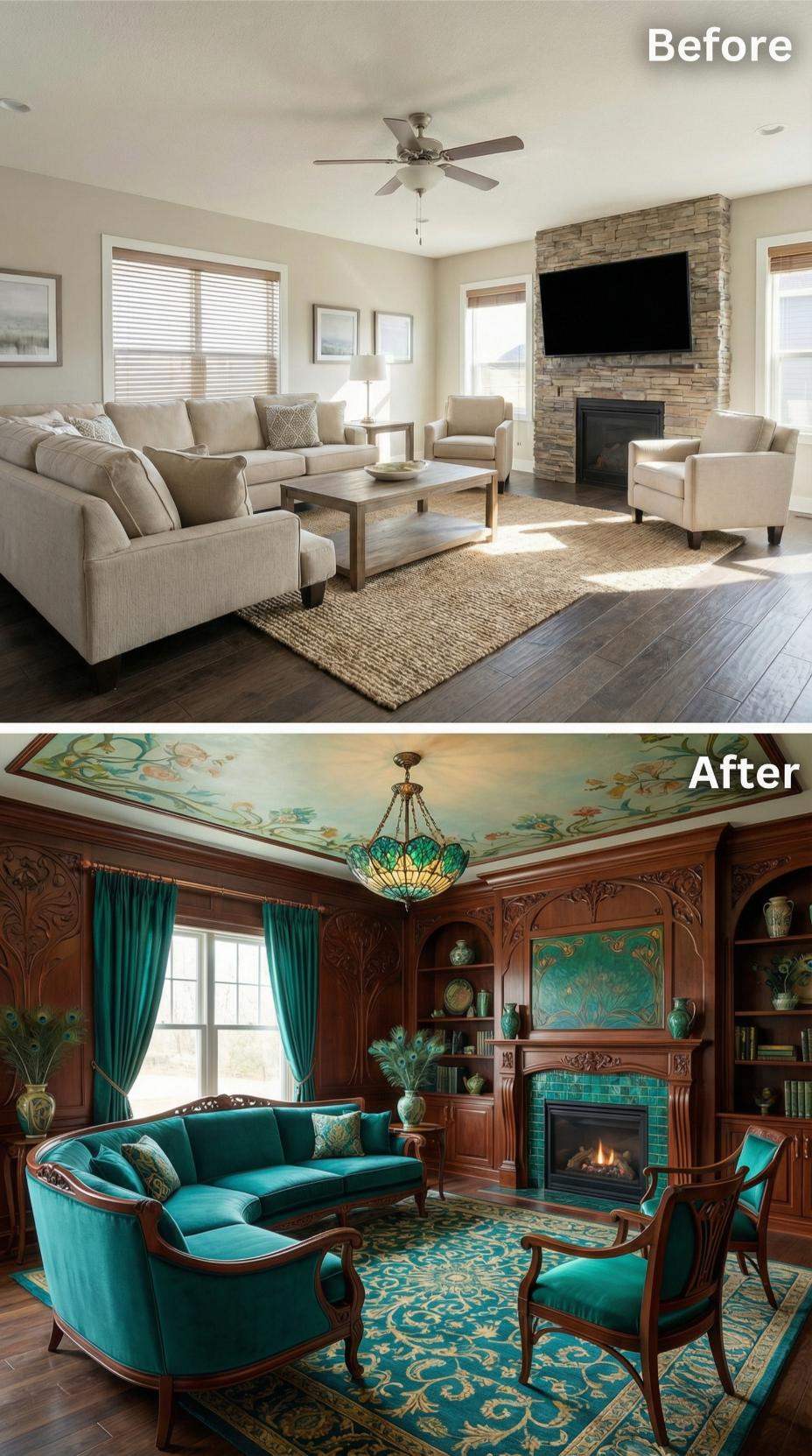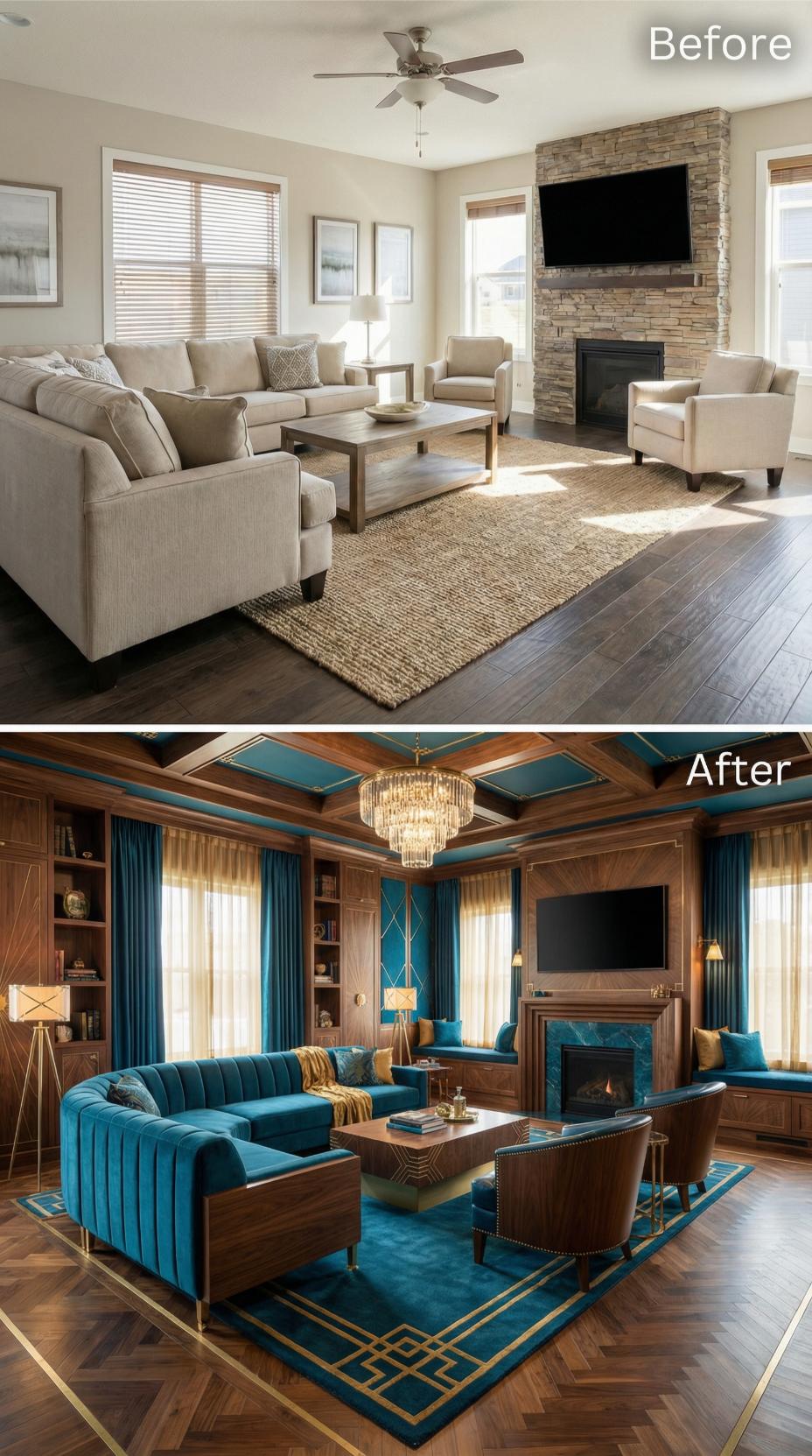 Rich teal velvet upholstery and dramatic coffered ceilings transform this formerly beige builder-grade living room into a sophisticated retreat. The updated space features custom built-in shelving, luxurious brass accents, and layered window treatments that create perfect ambient lighting. A stunning crystal chandelier replaces basic ceiling fans while geometric area rugs define intimate conversation zones ideal for quiet gatherings.