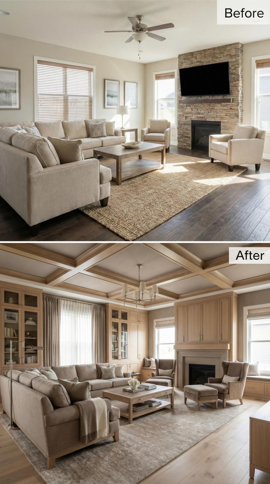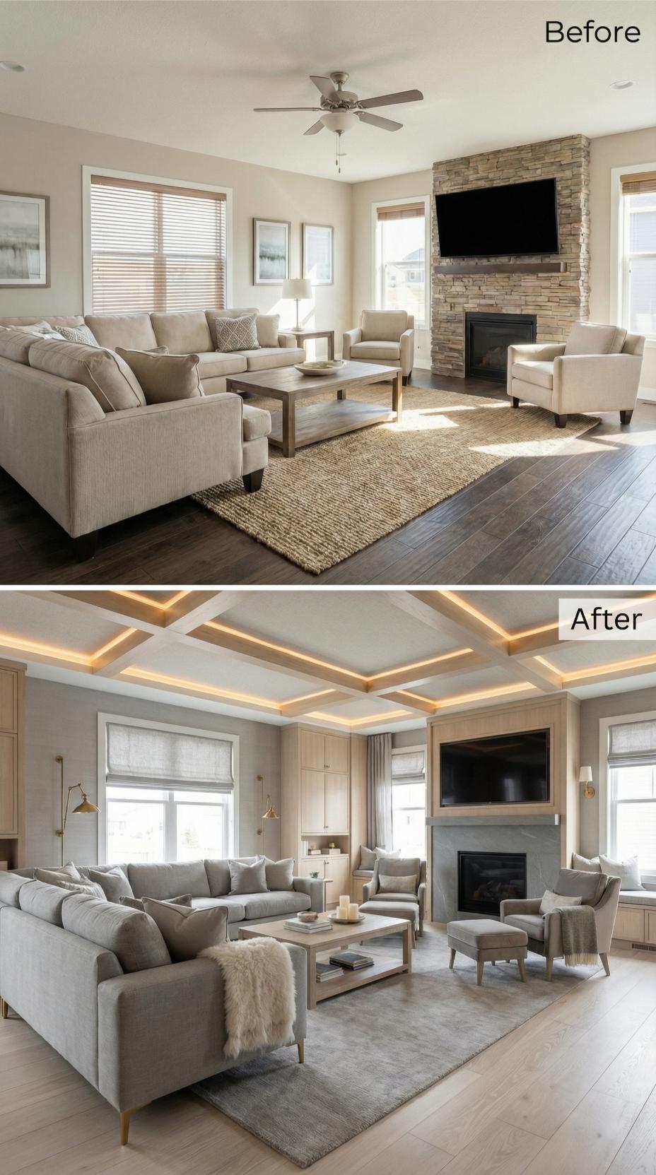 Dramatic coffered ceilings with warm LED lighting completely transform this builder-grade living room into an introvert’s dream retreat. Built-in cabinetry flanking the fireplace replaces basic walls, while luxurious gray sectionals and elegant Roman shades create intimate conversation zones. The sophisticated millwork and ambient ceiling lighting establish perfect mood control for quiet evenings and thoughtful gatherings.