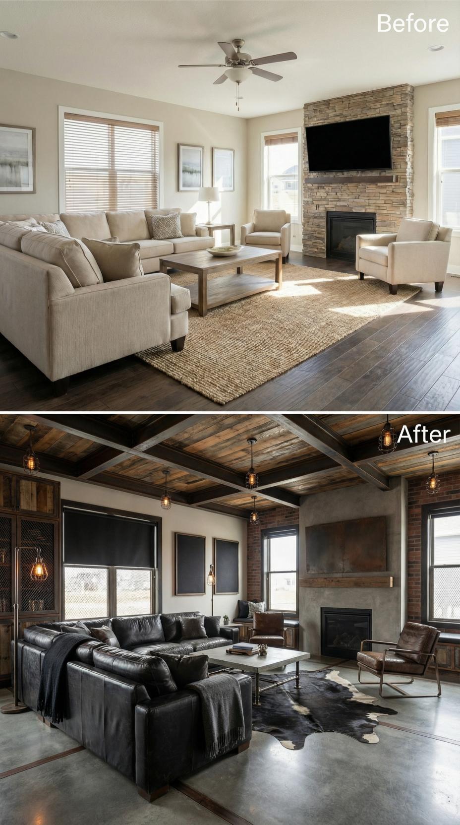 Dramatic exposed wood beams and industrial pendant lighting transformed this builder-grade living room into a sophisticated retreat perfect for introverts. Dark leather sectionals replaced bland beige furniture, while raw brick walls and metal accents created rich textural contrast. The coffered ceiling adds architectural depth, complemented by a striking cowhide rug that anchors the moody color palette of charcoals and warm browns.