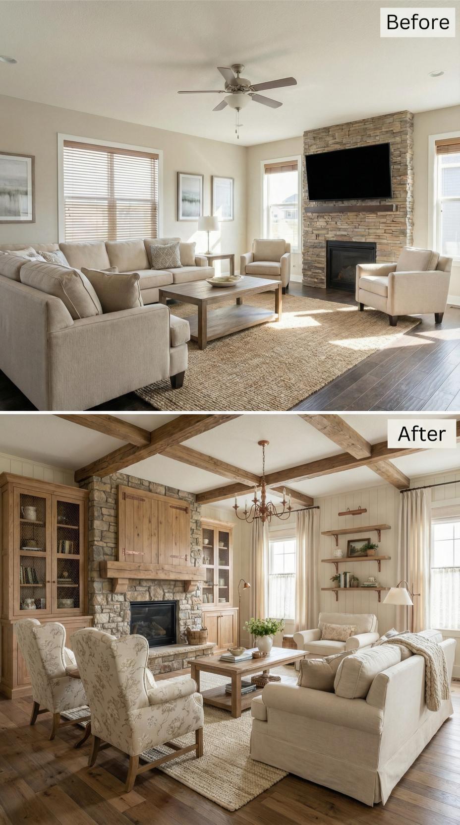 Exposed wooden ceiling beams and custom built-in cabinetry transformed this bland builder-grade living room for introverts into a cozy farmhouse retreat. Natural stone fireplace surround extends floor-to-ceiling, while patterned wingback chairs and floating shelves replace the sterile modern furniture. Warm wood tones, textured fabrics, and an elegant chandelier create intimate conversation areas perfect for quiet gatherings and peaceful relaxation.