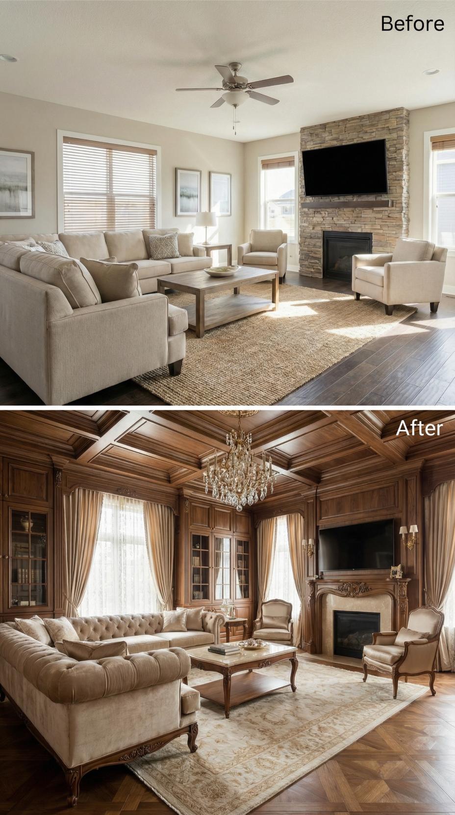 Dramatic coffered ceilings with warm wood trim elevate this once-plain space into a sophisticated retreat perfect for quiet contemplation. Custom built-in bookcases and cabinets replace the stark stone fireplace wall, creating intimate nooks for reading and relaxation. Rich wood paneling, flowing drapery, and a refined chandelier transform the builder-grade living room into an elegant sanctuary where introverts can comfortably entertain or unwind in luxurious solitude.