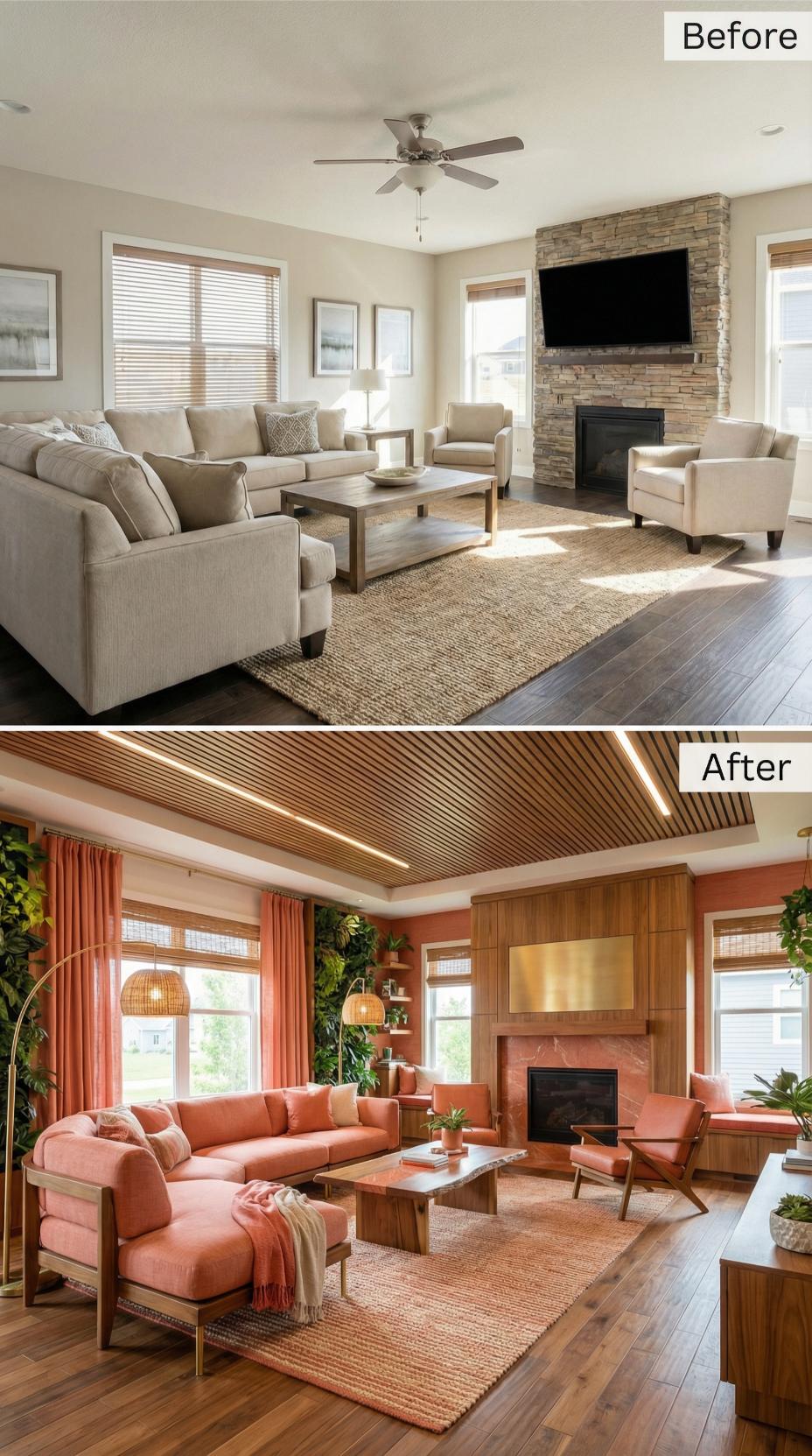 Warm coral tones completely transformed this builder-grade living room for introverts into a cozy mid-century retreat. Rich wood paneling replaced bland beige walls, while the dramatic wood-slat ceiling adds architectural interest overhead. Bold coral furniture creates an intimate conversation area, complemented by terracotta accents and lush greenery that brings life to every corner of this personality-packed space.