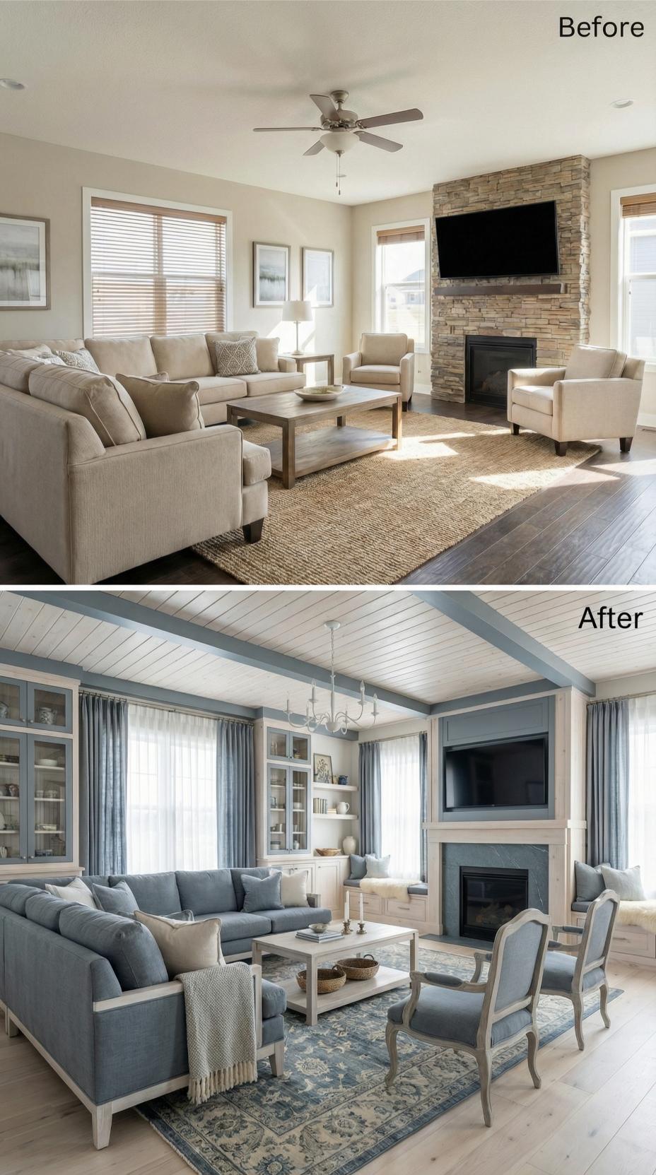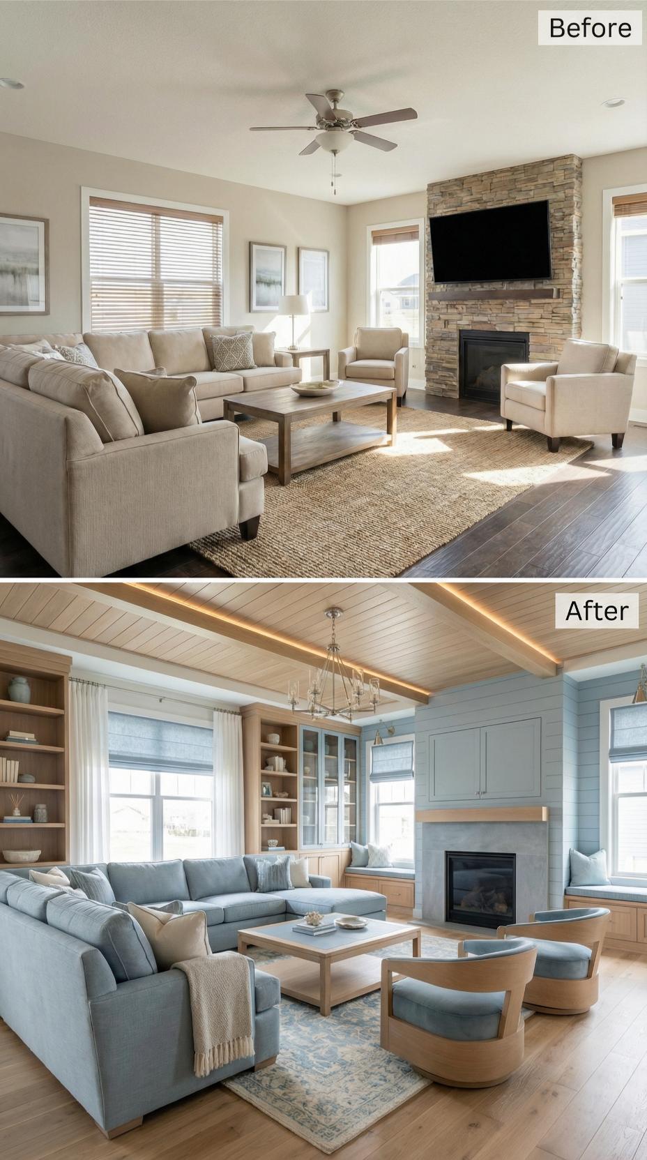 Sophisticated built-in shelving and window seating transform this builder-grade living room for introverts into a literary sanctuary. The original beige walls and basic stone fireplace give way to calming sage green cabinetry, shiplap paneling, and warm wood ceiling beams with integrated LED lighting. Plush blue sectional seating creates multiple conversation nooks, while the custom millwork provides endless display and storage opportunities for book lovers.